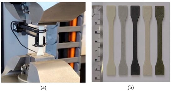 (a) Equipment used to perform tensile tests of 3D-printed samples; (b) 3D-printed test specimens fabricated from ABS and ABS-based composite filaments used for mechanical characterization. Materials are arranged from left to right as follows: ABS, ABS–5BN, ABS–30W, ABS–10Gd2O3, and ABS–30Bi2O3.