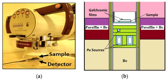 Radiation attenuation was evaluated for all samples using two irradiation conditions: X-rays (120 kVp) and mixed neutron–photon fields from a Pu–Be source. For both modalities, a reference dose was measured in the direct beam, followed by the transmitted dose with the sample in place. All exposures delivered a nominal 1 Gy. Measurements were performed for individual samples and for a multilayer stacked configuration (Figure 5), where the incident beam entered the materials in the following order: