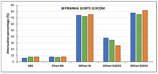 The attenuation of X-rays in the energy range of 120 kVp is governed primarily by the photoelectric effect, which scales steeply with the atomic number (Z4 − 5) of the absorbing material. This fundamental principle is directly reflected in the measured attenuation percentage of the shielding composite materials (Figure 11). The material with the lowest measured performance, ABS–5BN, showed only ~7.98% attenuation. This result is expected because boron compounds (such as boron nitride) consist of low-Z elements and thus offer minimal photon shielding. A substantial increase in shielding was observed with high-Z fillers. The ABS–30W composite achieved ~72–75% attenuation across Piranha, EBT3, and XCOM, reflecting tungsten’s high photoelectric interaction probability at energies around 120 kVp. The ABS–30Bi2O3 composite demonstrated the highest overall attenuation (~78–82%), which is consistent with bismuth’s higher atomic number and its K-edge proximity (90.5 keV) to the peak of the 120 kVp X-ray spectrum, enhancing photoelectric absorption [31,54]. The ABS–10Gd2O3 composite provided ~35–40% attenuation which is lower than W and Bi2O3 due to both its lower weight fraction and lower Z.