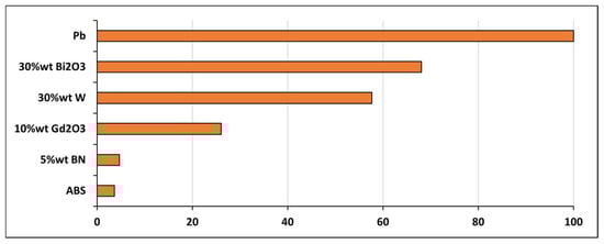 The RAE results were found to clearly distinguish the shielding capabilities of the composites (Figure 12). Lead was measured as the reference material (100%), while ABS–30Bi2O3 was determined to reach ~68%, representing the highest efficiency among the lead-free samples. ABS–30W was observed at ~58%, and ABS–10Gd2O3 at ~26%. Very low efficiencies (<5%) were recorded for ABS–5BN and pure ABS. Generally, the RAE values were shown to align with the attenuation and MAC trends.