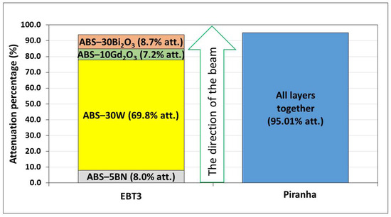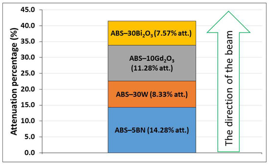 Under Pu–Be irradiation, the multilayer exhibited a cumulative attenuation composed of distinct contributions from each layer (Figure 15), reflecting the differing neutron interaction mechanisms of the fillers [57]. The BN-containing layer exhibited the largest effective attenuation (~14.3%), which is consistent with the strong affinity of boron for absorbing thermalized neutrons. The ABS–10Gd2O3 layer followed (~11.3%), supported by gadolinium’s exceptionally high thermal neutron capture cross-section. These two layers dominated the overall response, suggesting that neutron capture-related processes played a dominant role in the effective mixed-field attenuation. The noticeable, though smaller, contributions from the ABS–30W and ABS–30Bi2O3 layers (~8.3% and ~7.6%, respectively) show that photon-sensitive materials still played a role in the mixed field, consistent with the fact that EBT3 integrates both a neutron- and photon-induced dose. Because the layers were arranged in an alternating neutron–photon–neutron–photon attenuating materials sequence, the observed pattern reflects the interplay between moderation/capture processes and photon attenuation rather than a simple upstream–downstream depletion effect. The results therefore highlight that, in this geometry, neutron-active fillers largely govern dose reduction, while high-Z layers mainly provide an additional, secondary contribution linked to the photon component of the Pu–Be field.
