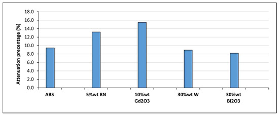 The mixed-field attenuation under Pu-Be source irradiation for single sample results demonstrated behavior distinct from the X-ray measurements, reflecting the fundamentally different interaction mechanisms governing neutrons and secondary photons. In general, attenuation remained modest (8–16%), as can be observed in Figure 14, which is expected for thin polymer-based samples exposed to a broad neutron spectrum. The highest reduction was observed for ABS–10Gd2O3, consistent with gadolinium’s exceptionally high thermal neutron capture cross-section [44]. A similar, though smaller, enhancement was recorded for ABS–5BN, consistent with boron’s capacity to absorb thermalized neutrons [42]. In contrast, ABS–30W and ABS–30Bi2O3 exhibited only limited attenuation, aligning with the fact that high-Z fillers contribute minimally to fast-neutron moderation or capture. However, some measurable attenuation was still detected in these composites because the EBT3 film recorded an integrated response to both neutron-induced dose and accompanying secondary photon dose. As a result, photon interactions within W- and Bi-containing samples contributed to the measured film response, and the reported attenuation values therefore represent an effective mixed-field dose reduction rather than a quantitative separation of neutron capture and photon attenuation mechanisms.