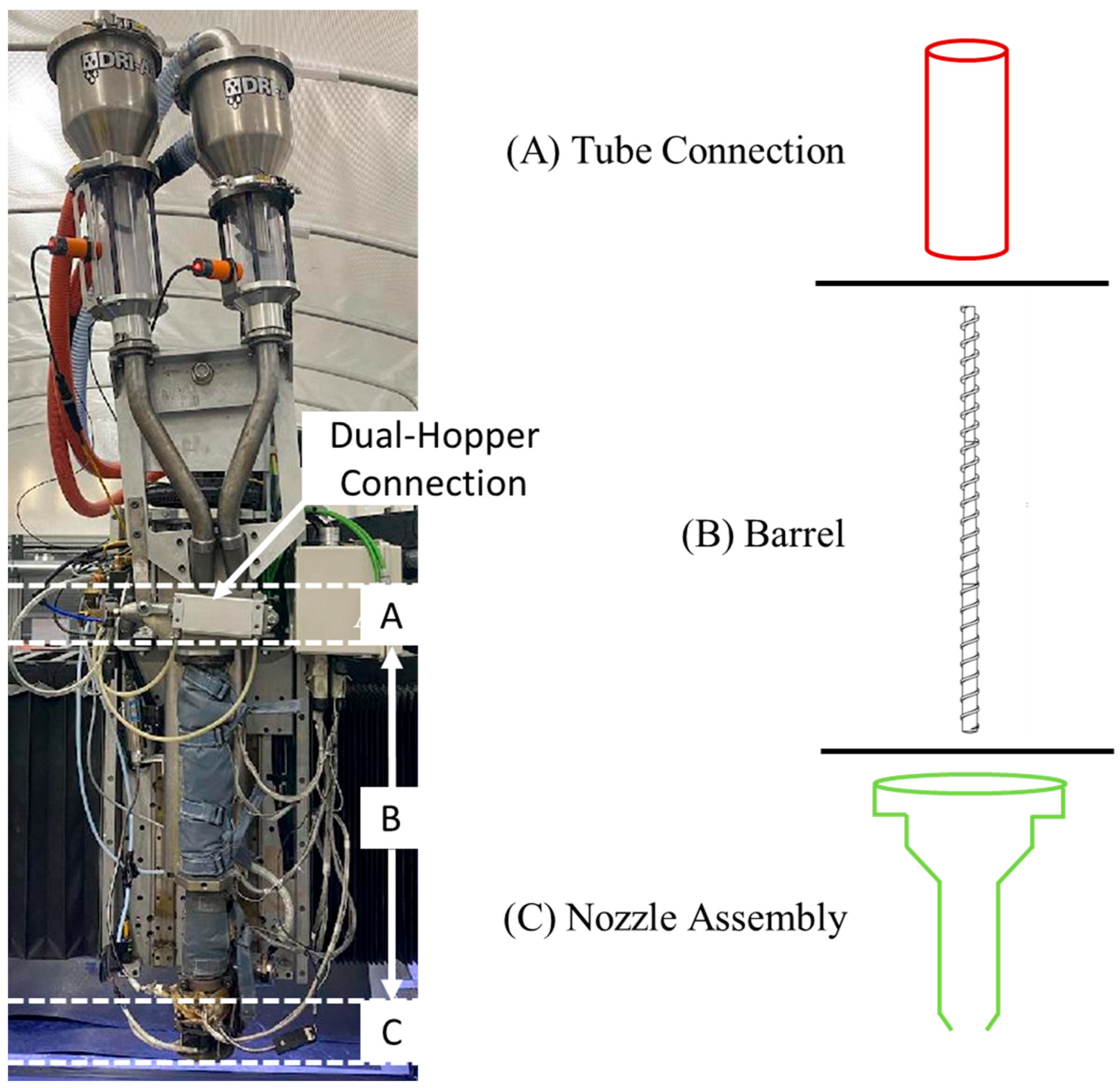 - Smith, T.; Hassen, A.A.; Lind, R.; Lindahl, J.; Chesser, P. Dual material system for polymer large scale additive manufacturing. In Proceedings of the Society for the Advancement of Material and Process Engineering 2020, Seattle, WA, USA, 17 October 2020. [Google Scholar]