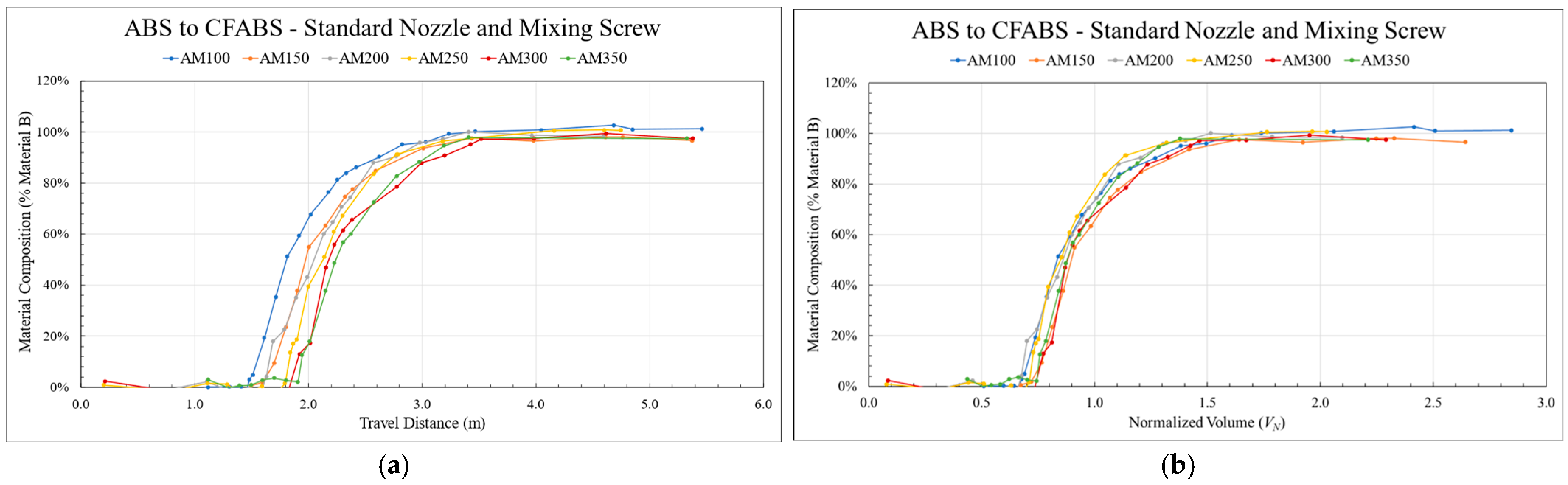 - Brackett, J.; Cauthen, D.; Smith, T.; Kunc, V.; Duty, C. The influence of processing parameters on the transition zone for blended material 3D printing. In Proceedings of the SAMPE 2020 Virtual Series|Additive Manufacturing, Seattle, WA, USA, 1 June 2020; Available online: https://www.digitallibrarynasampe.org/data/webpages/s2020_webpages/165-TP20-0000000249.html (accessed on 18 November 2022).