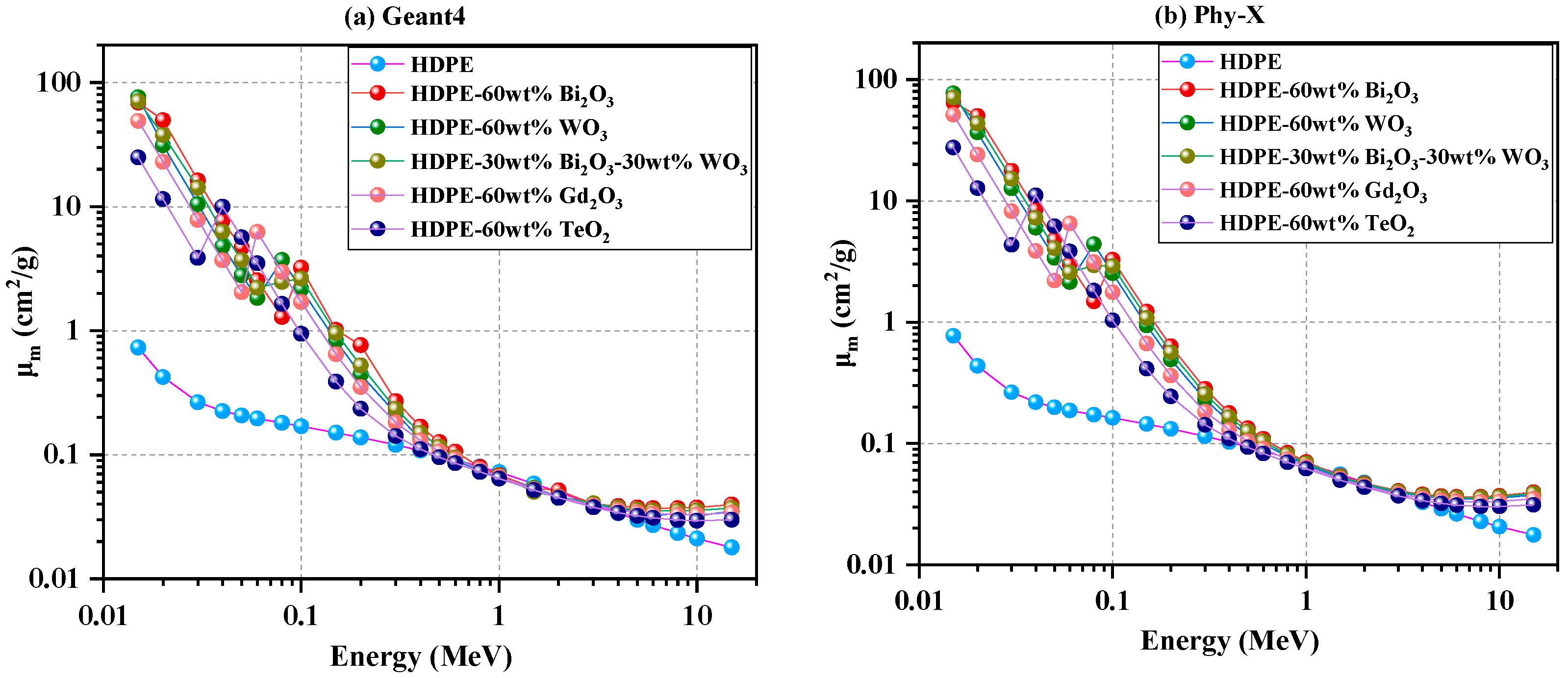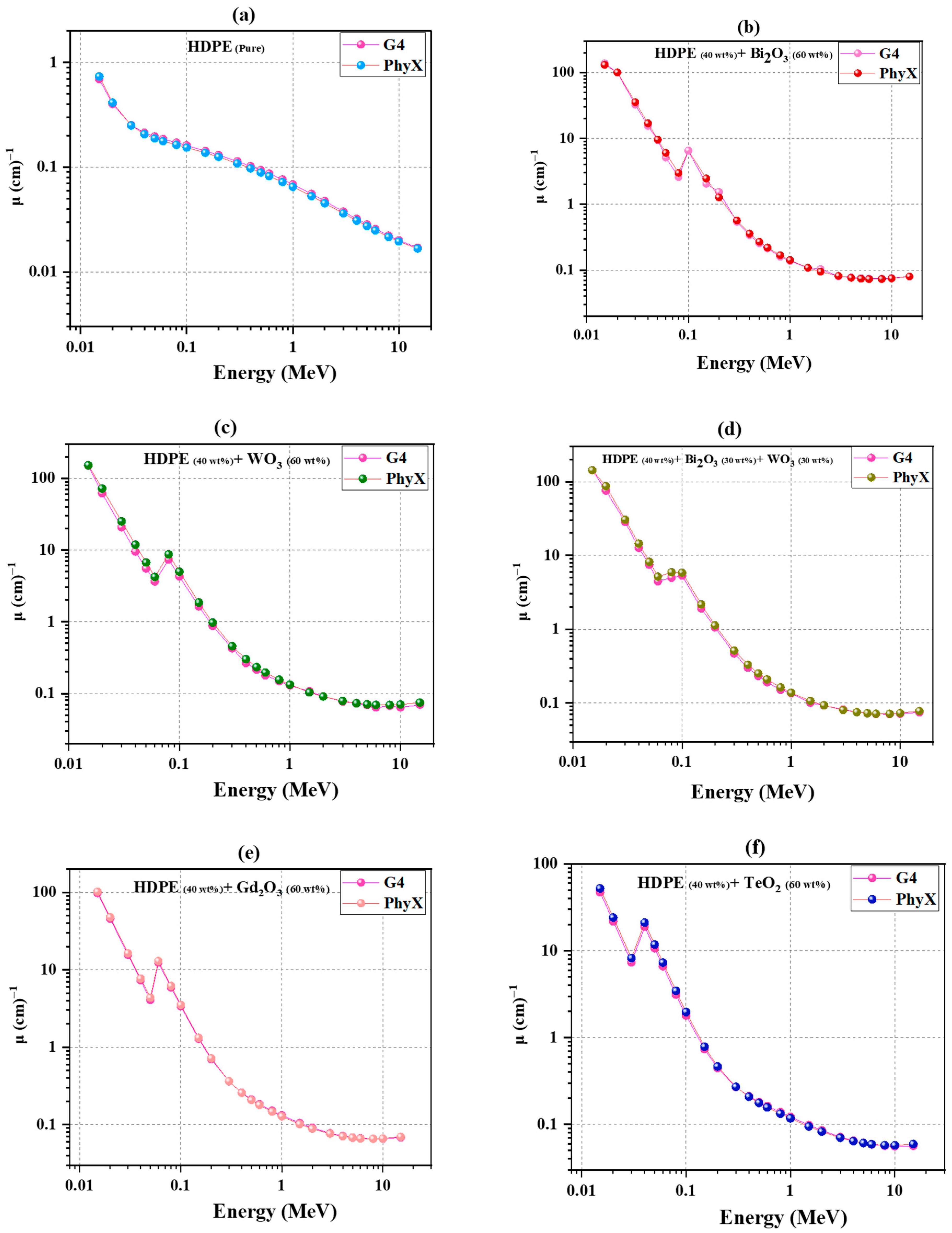 21]. Although these oxides have individually shown excellent attenuation capability, only a few studies have systematically compared their combined influence when incorporated into polymer composites. Moreover, hybrid analyses that integrate Monte Carlo (Geant4) simulations and semi-empirical (Phy-X/PSD) methods for HDPE-based oxide systems remain scarce—particularly across the wide photon-energy range covering photoelectric, Compton, and pair-production regions. This absence of integrated evaluation defines the knowledge gap addressed in the present work. In particular, no previous study has provided a unified, side-by-side assessment of Bi