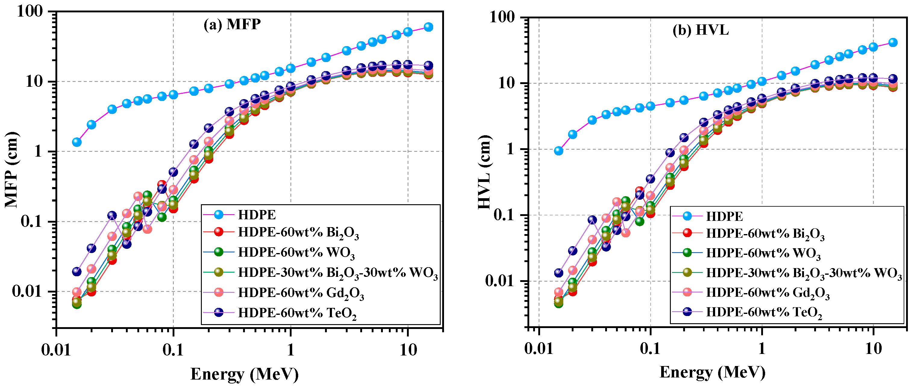 Figure 4 presents the mean free path (MFP) in panel (a) and the half-value layer (HVL) in panel (b), enabling direct comparison of the photon-attenuation behavior across the studied energy range.