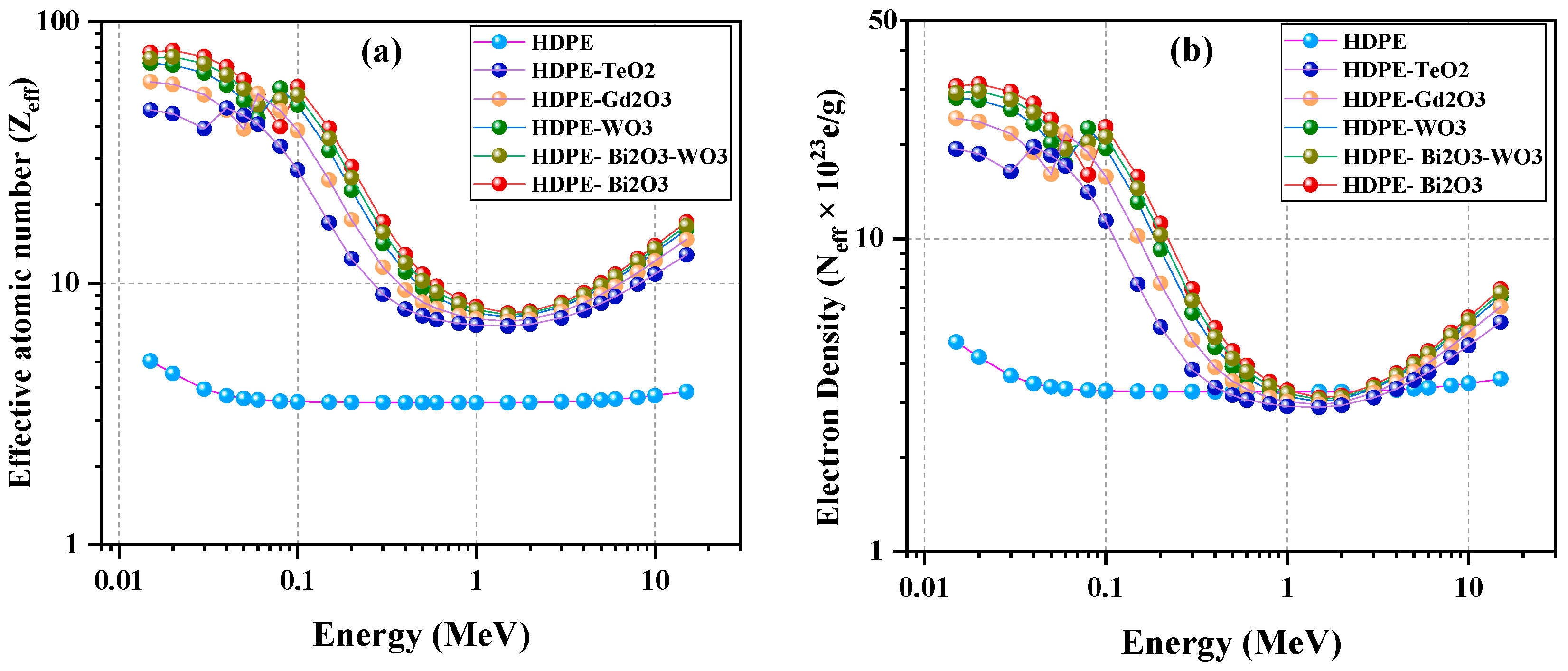 At 0.015 MeV, C1 (HDPE) records approximately Zeff ≈ 5.0 and Neff ≈ 5 × 1023 e g−1, while C2 (Bi2O3) reaches about 80 and 30 × 1023 e g−1, respectively. Comparable low energy enhancements observed for C3 (Bi2O3/WO3) and C4 (WO3) with Zeff ≈ 70–73, and Neff ≈ 28–29 × 1023 e g−1, followed by C5 (Gd2O3) and C6 (TeO2), which still exceed the polymer baseline with Zeff ≈ 60, and 45 and Neff ≈ 24 × 1023 e g−1 and 20 × 1023 e g−1, respectively. With increasing energy, above about 0.2 MeV, both Zeff and Neff decrease and gradually converge among the composites as Compton scattering and pair production become dominant. Around 1 MeV, C2 retains the highest interaction probability (Zeff about 8; Neff about 3.0 × 1023 e g−1), while HDPE remains the lowest (Zeff ≈ 3–4). However, in this Compton-dominant region, the Neff values of all systems—including neat HDPE—become nearly identical, reflecting the fact that Compton scattering depends mainly on the number of electrons per gram rather than on atomic number. At higher energies (up to 15 MeV), minor differences persist, confirming the sustained advantage of oxide-reinforced systems over the neat polymer.