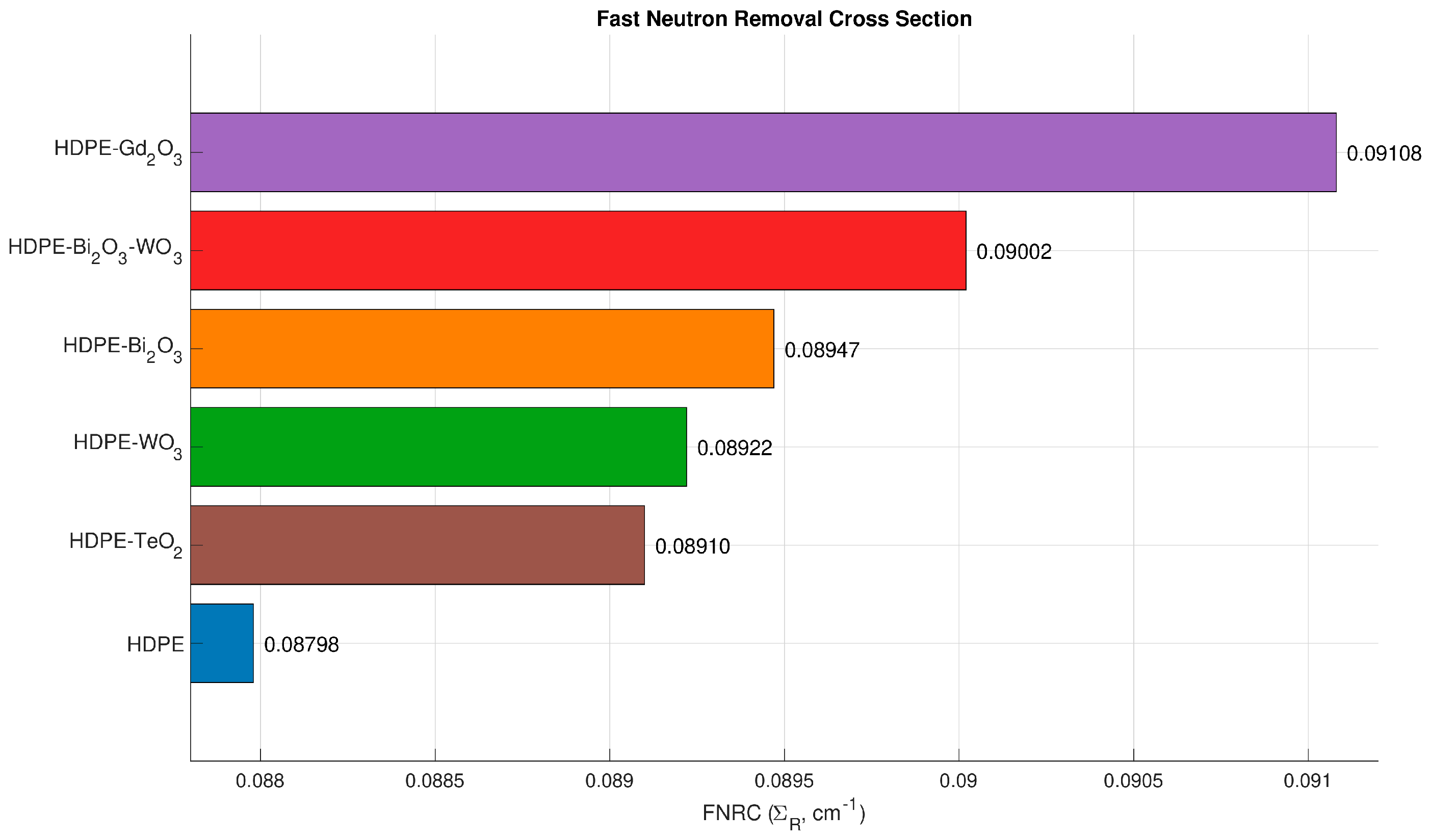 R reflect improved probabilities of fast-neutron attenuation within the composites. This improvement is primarily attributed to the synergistic moderation of hydrogen in HDPE and the superior neutron-capture potential of Gd