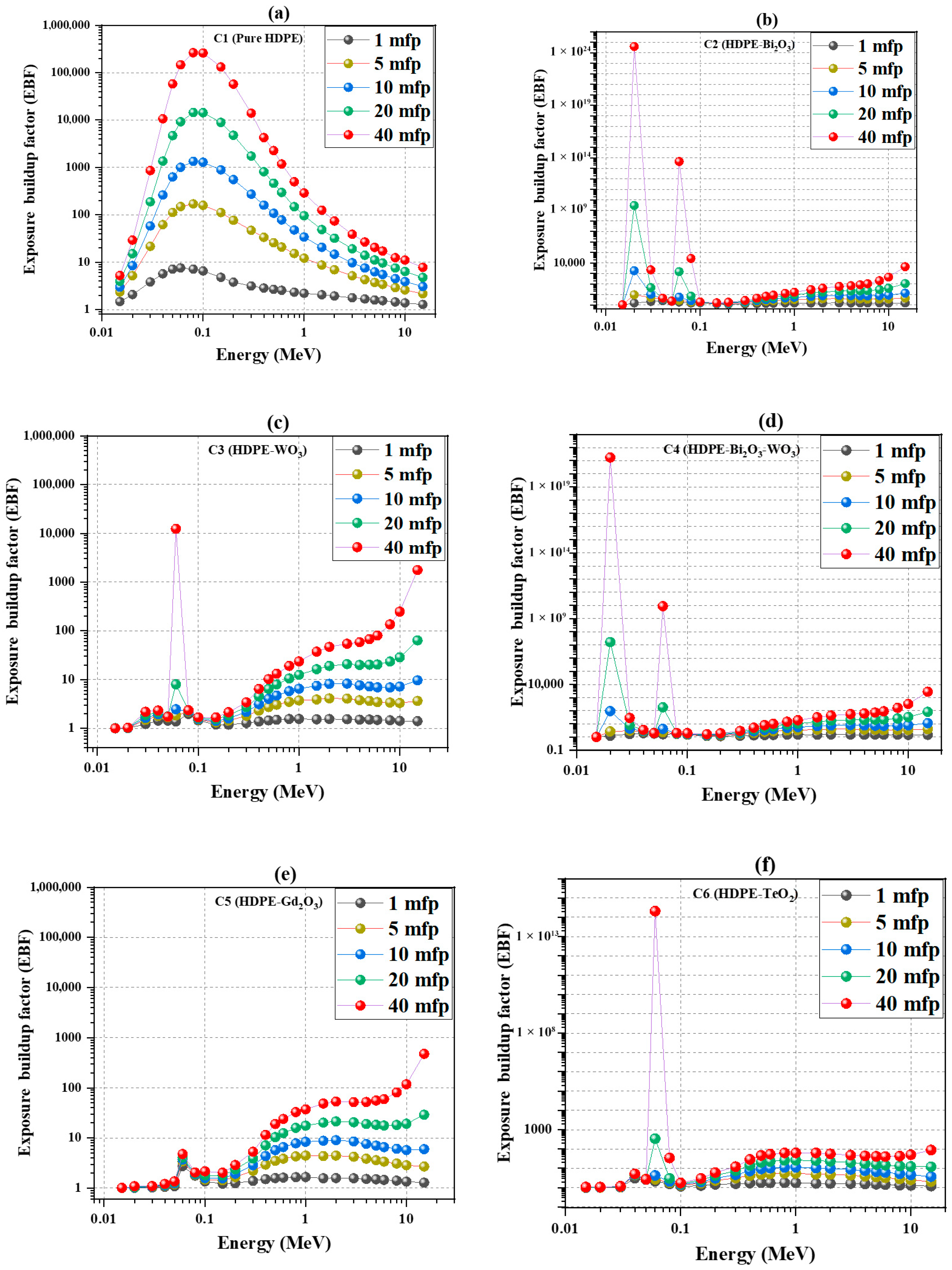 2) record slightly higher values but remain far below the polymer baseline (C1). In the Compton-dominated region (≈0.3–1 MeV), the contrast remains pronounced: at 1 MeV and 40 MFP, C1 reaches ≈300, whereas C2–C4 range between 25 and 40 and C5–C6 between 60 and 100. At higher energies (>3 MeV), all composites exhibit a moderate increase in buildup with increasing penetration depth, resulting from secondary photon and positron cascades. At 15 MeV and 40 MFP, C2 and C3 reach ≈(3–4) × 10