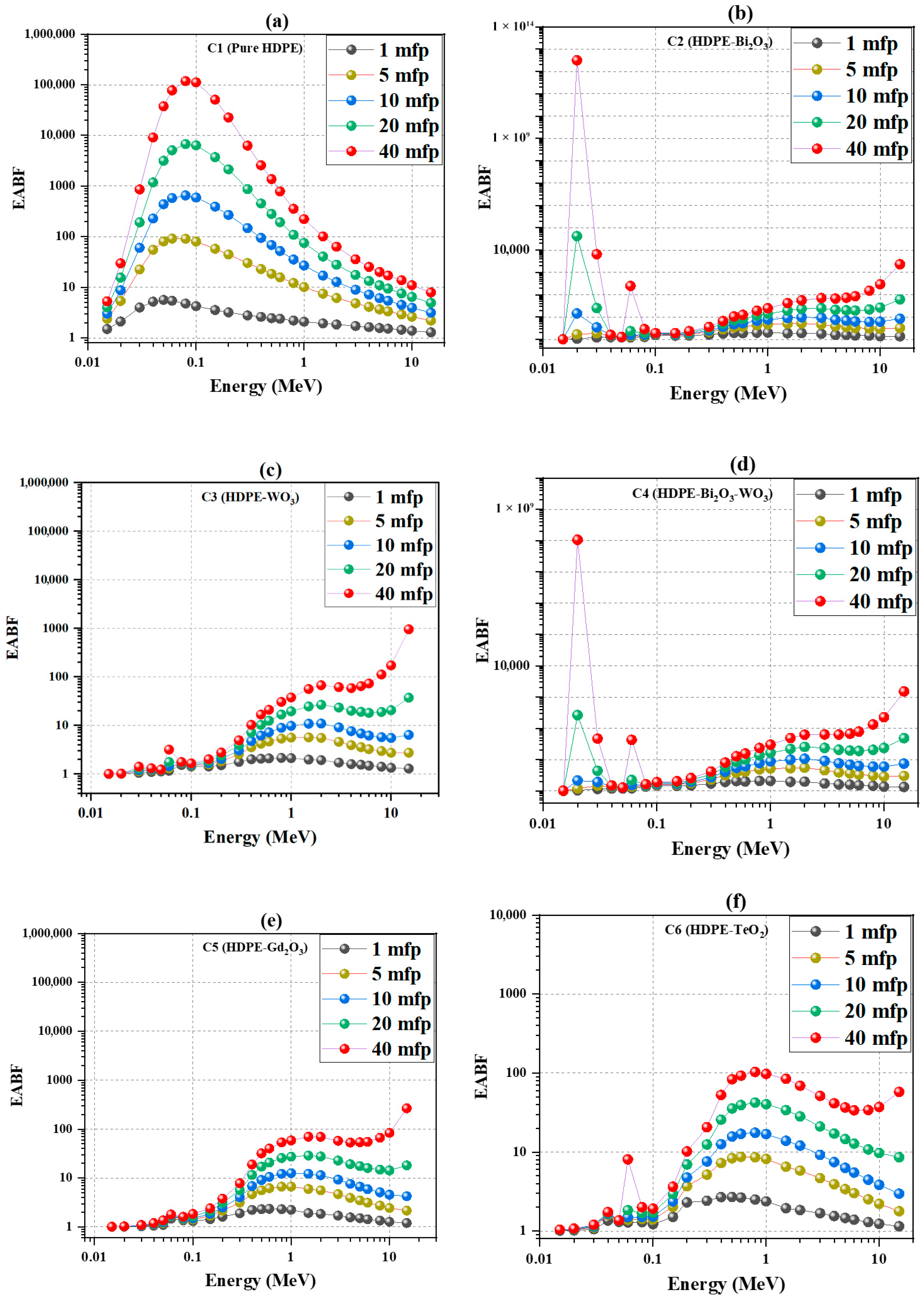 At higher energies above 1 MeV, particularly in the pair-production region (5–15 MeV), all samples show a further smooth rise in MFP. Nevertheless, the composites maintain shorter paths—≈13–15 cm compared with ≈50–60 cm for HDPE—demonstrating that dense oxides preserve significant interaction probability even at high photon energies.