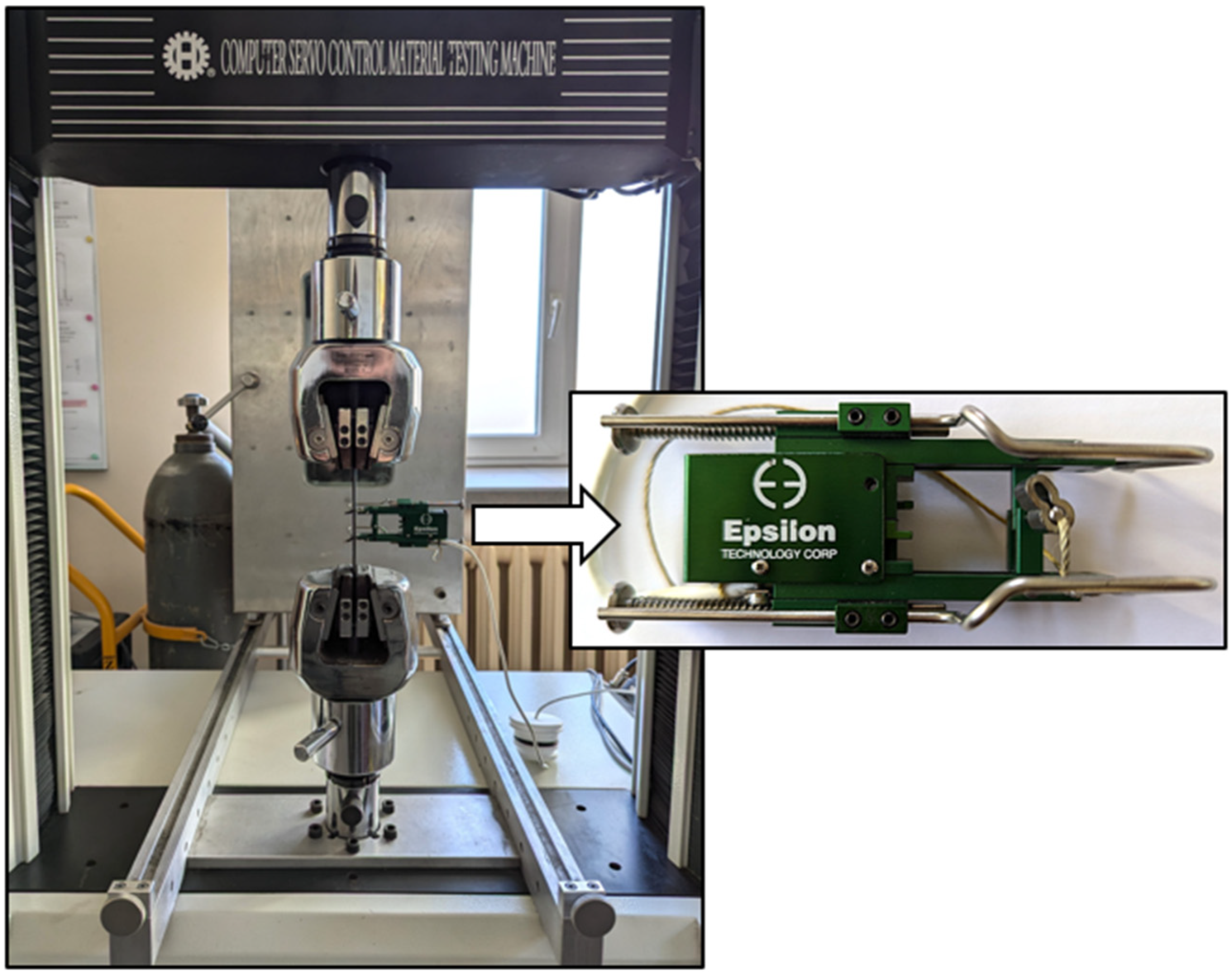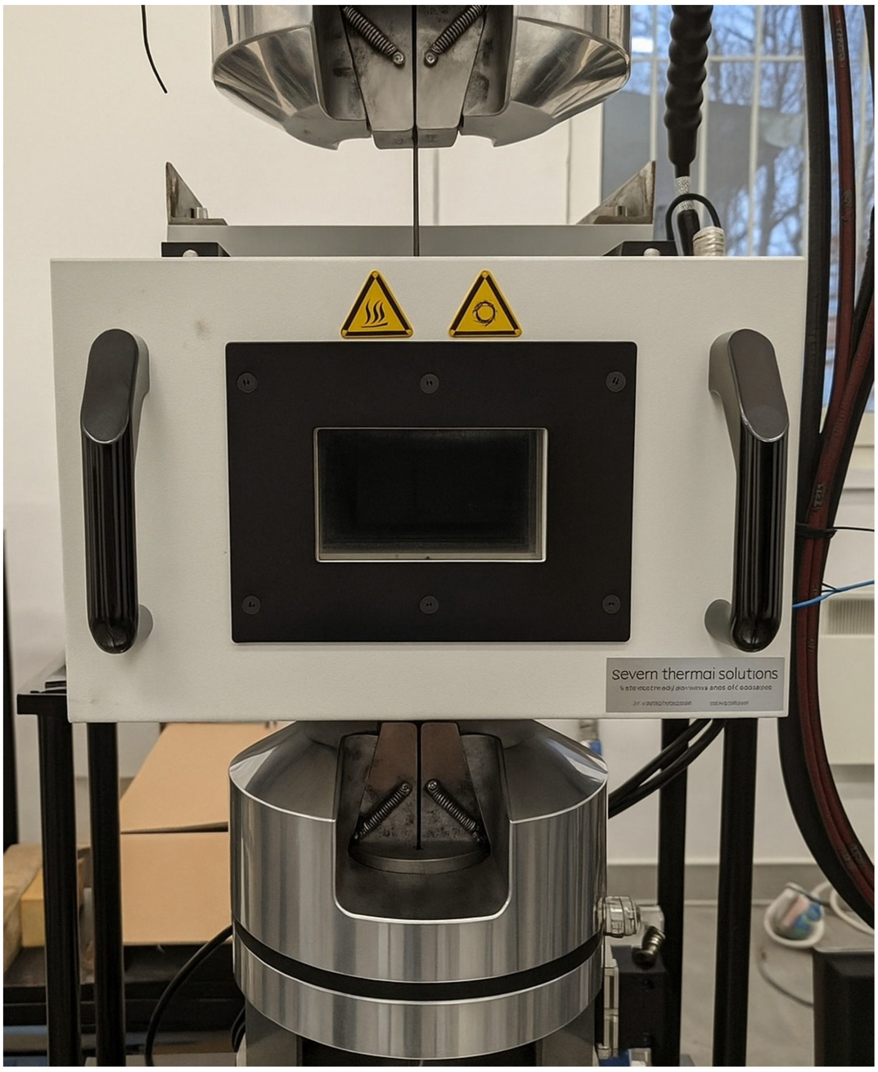 Static strength and fatigue life tests were conducted under controlled temperature conditions using a universal hydraulic testing machine MTS 809 Axial (MTS, Eden Prairie, MN, USA) with a Severn Thermal Solutions thermal chamber (Severn Thermal Solutions, Dursley, UK)—