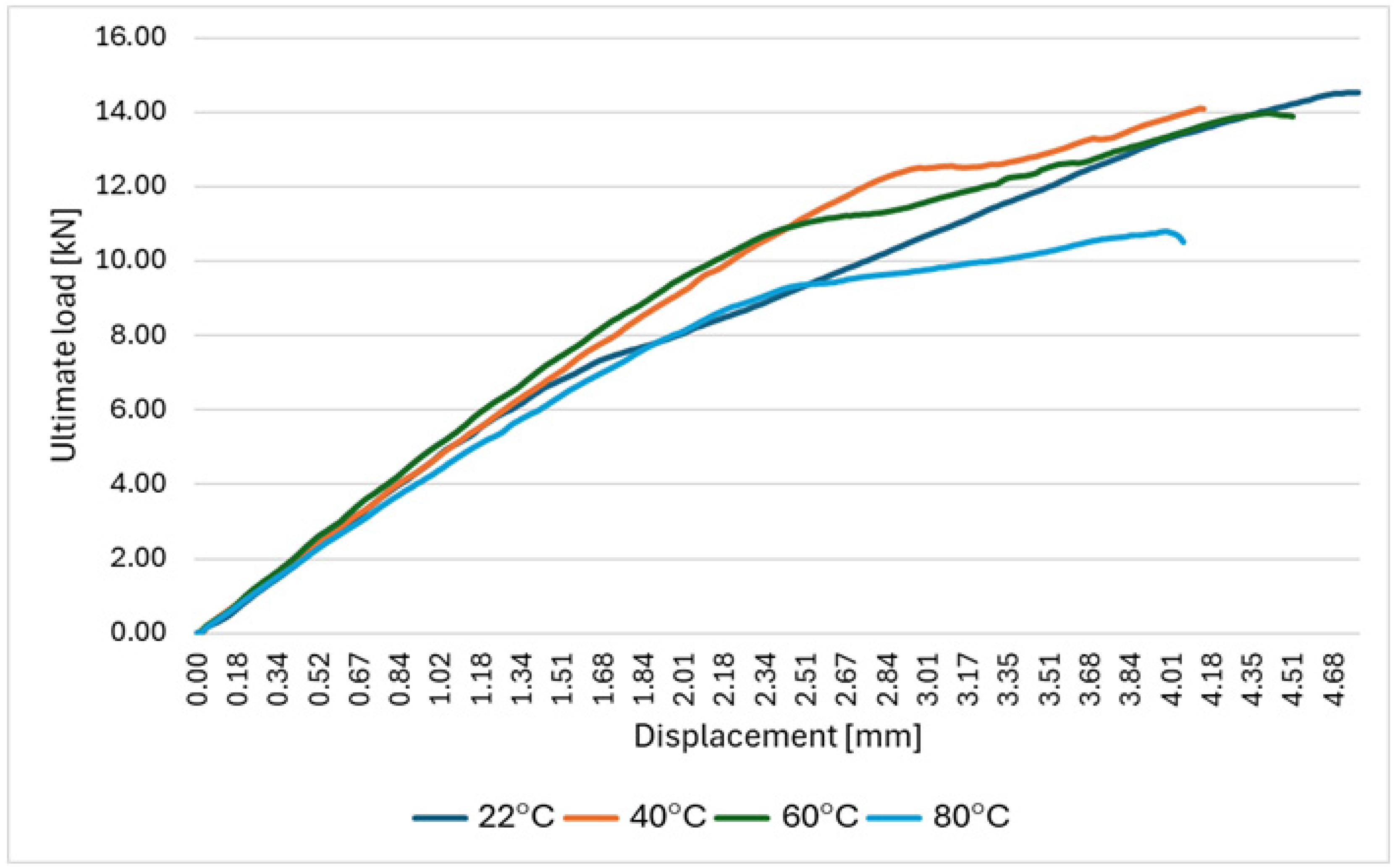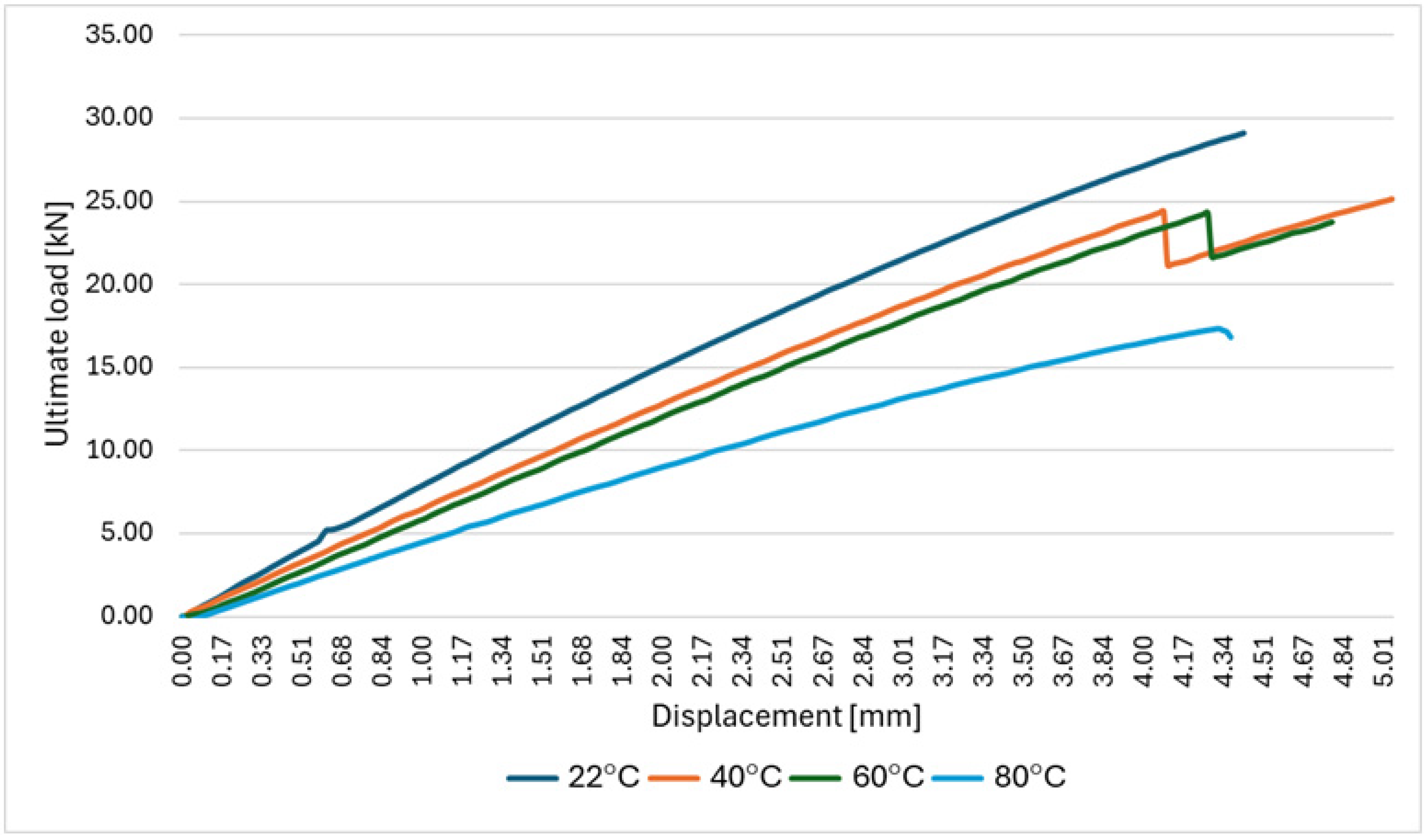 Figure 7, it was found that an increase in temperature leads to a significant decrease in the maximum load at which the CFRP composite material is damaged. The reference value is the average value of the force required to damage the composite at ambient temperature (approximately 22 °C)—29,153 N. An increase in temperature to 40 or 60° causes a slight decrease in the average maximum load—by several percent. However, a further increase in temperature up to 80 °C causes a sudden drop to an average value of 17,358 N.
