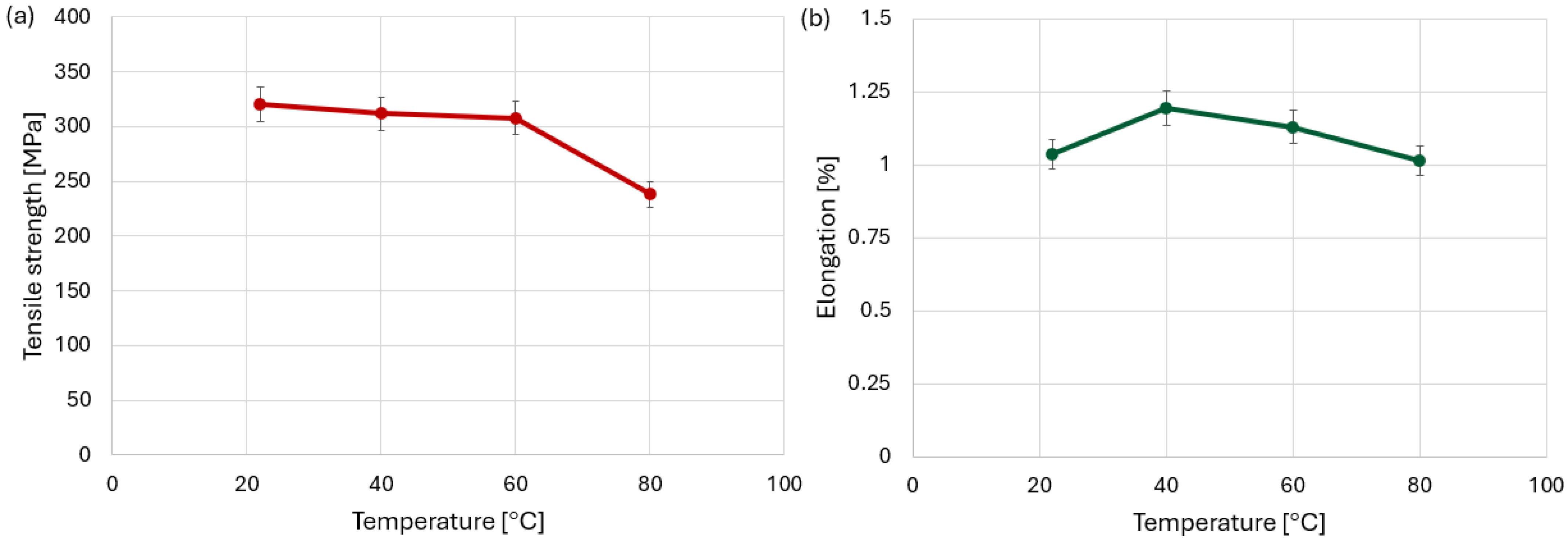 Figure 8b) showed that an increase in temperature by 20–40 °C causes an increase in elongation. The maximum average elongation observed at 40 °C can be associated with a temporary increase in matrix ductility, where the material can accommodate higher strain before catastrophic damage initiates. At a temperature of 80 °C, however, the elongation reaches a value similar to that at room temperature.