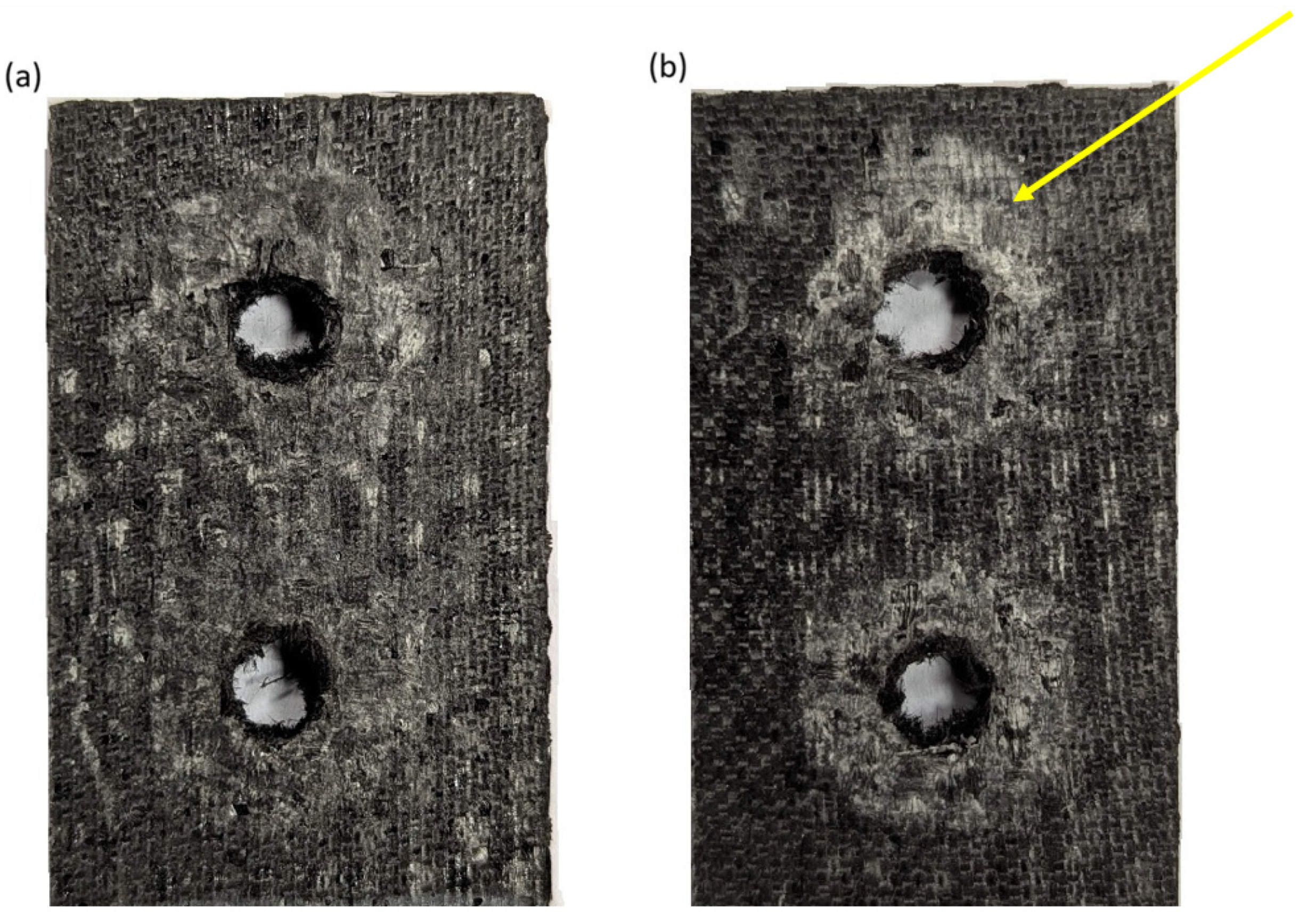 Figure 11b). The area around the fasteners shows enlarged crushing and delamination areas. These effects are typical when the temperature approaches the glass transition point of the resin—the matrix softens significantly, increasing susceptibility to abrasion, deformation, and wear in the joint area.