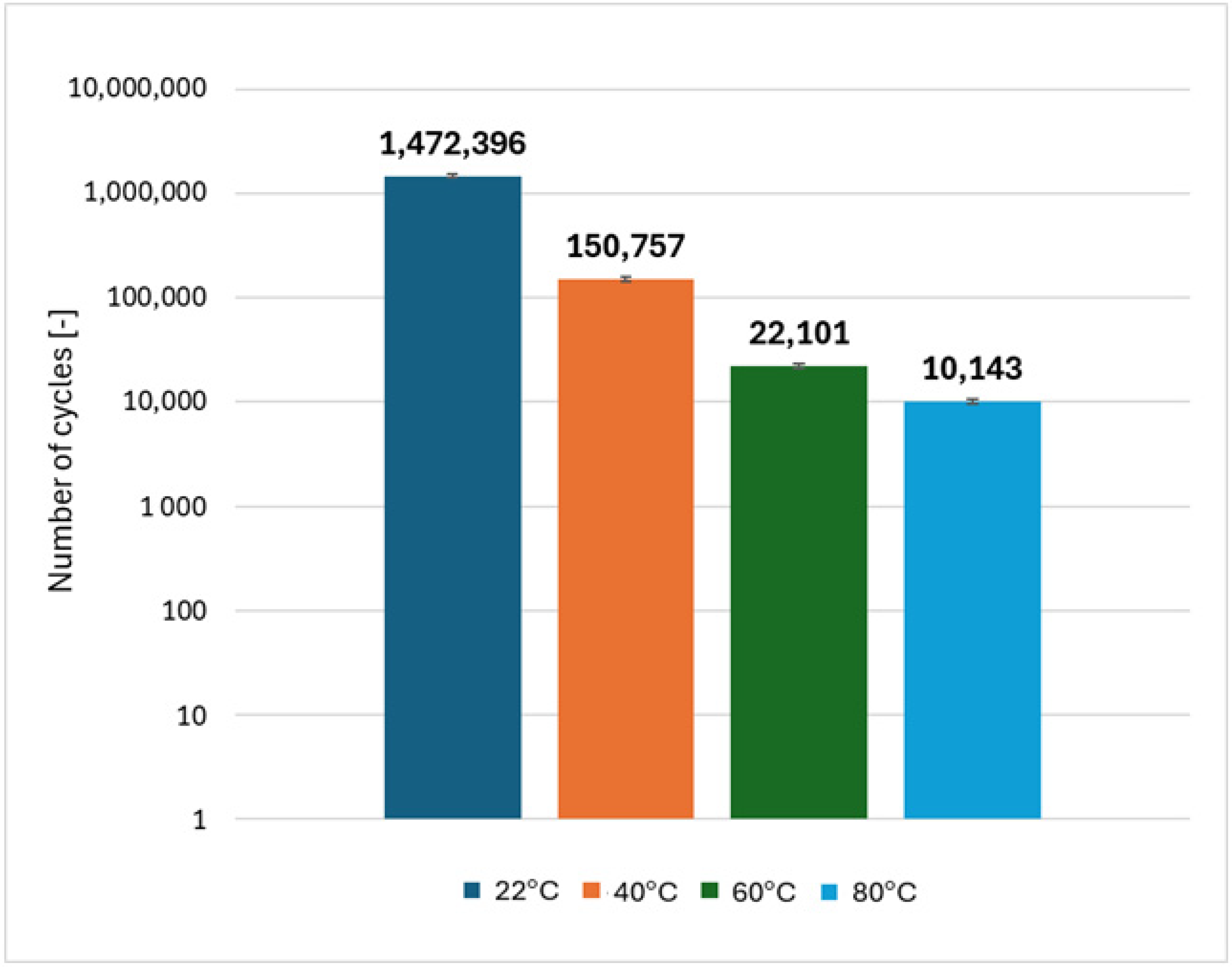 The application of the same method and the use of different load ranges for CFRP bolted joints (3–10 kN at 22 °C, 3–10 kN at 40 °C, 3–9 kN at 60 °C and 3–8 kN at 80 °C) did not provide consistent results. A further decrease in fatigue life was observed with increasing temperature. The fatigue life of the bolted joint at 80 °C, despite the significantly lower load conditions, is only 0.5% of the fatigue life of the joint at room temperature—