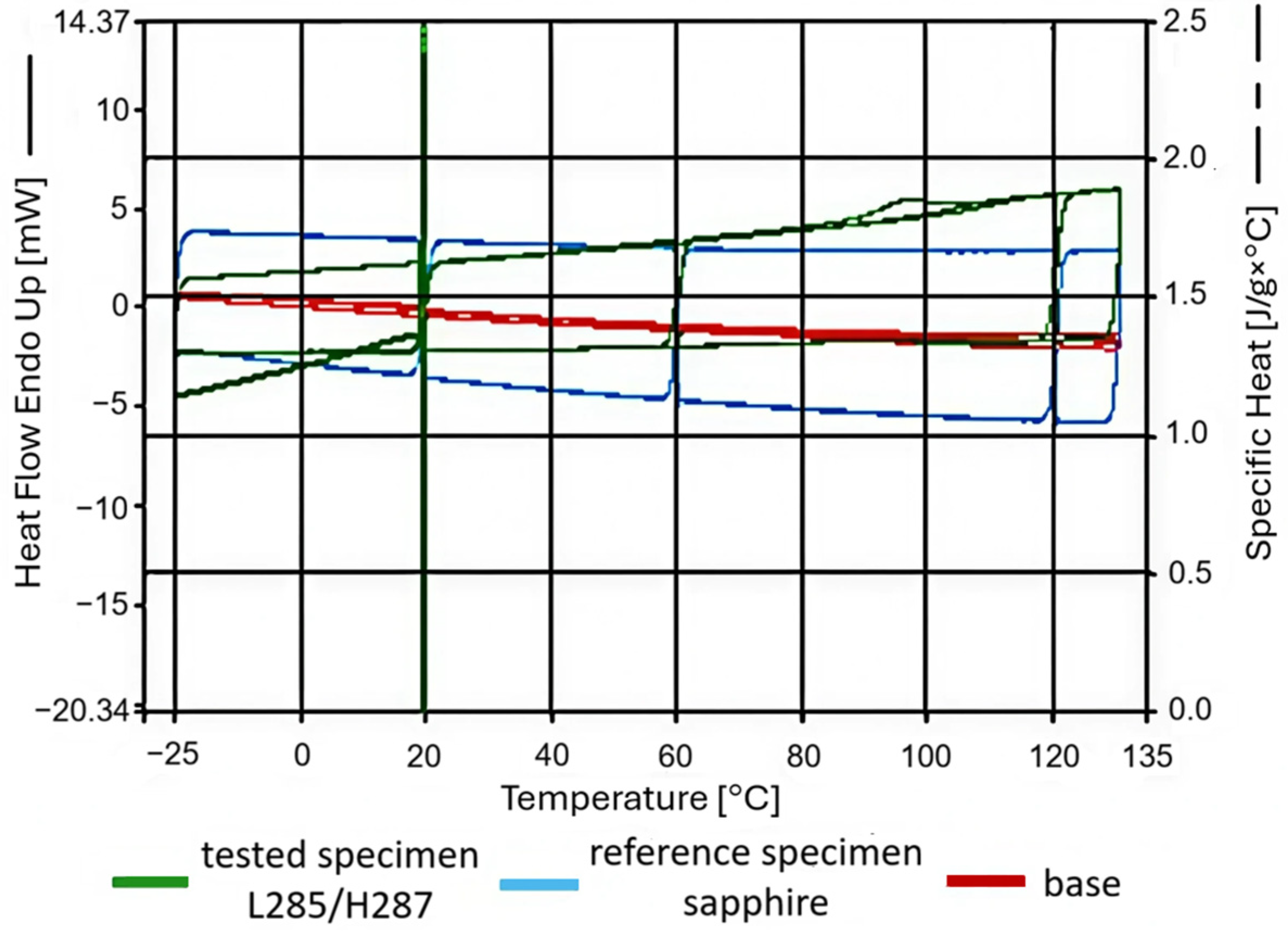 Figure 14 shows an example of a recorded thermogram, where the green color represents the test specimen made of L285/H287 resin, the blue color represents the sapphire reference specimen, and the red color represents the base—an empty vessel test.