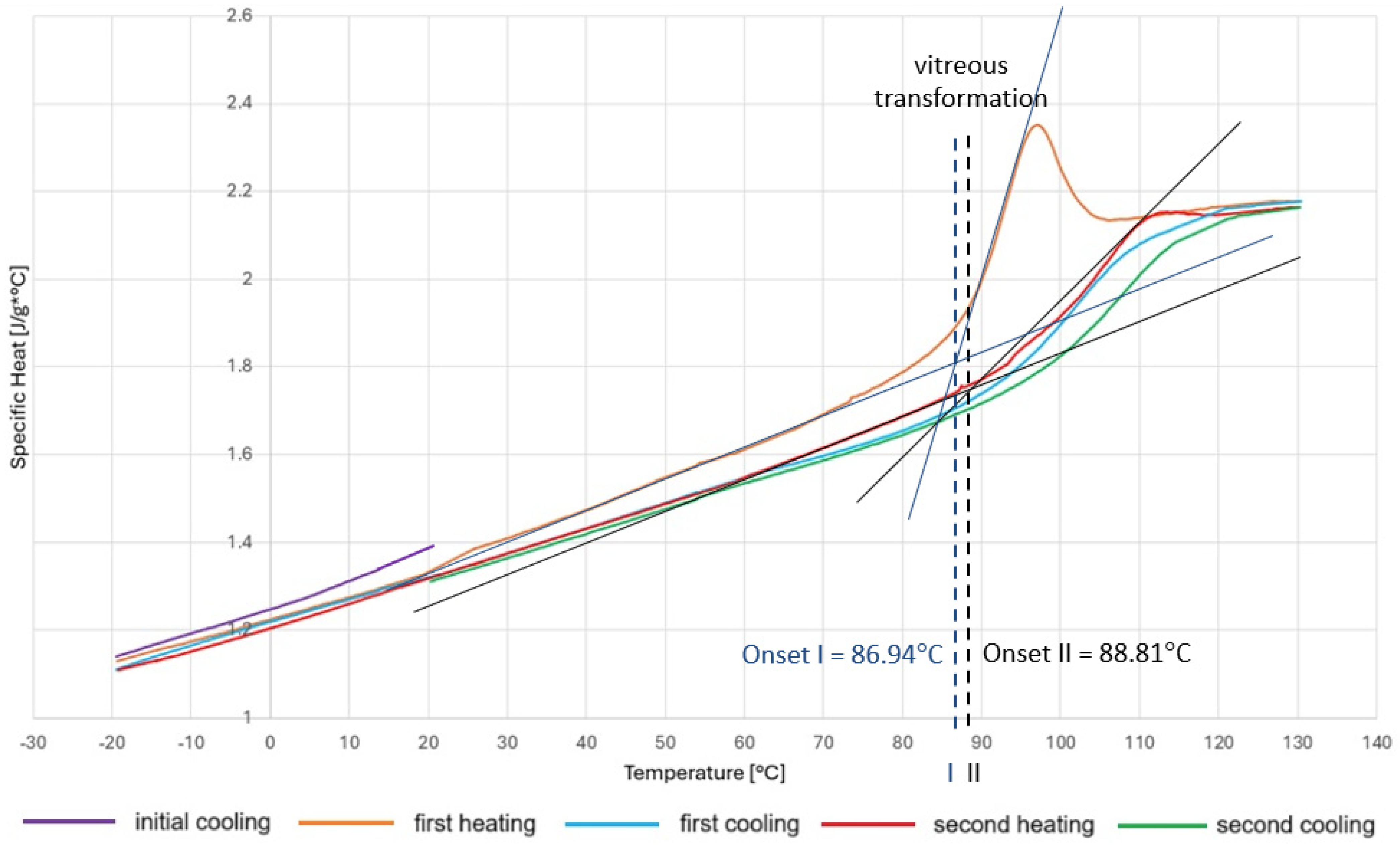 The actual glass transition temperature of the resin was determined using differential scanning calorimetry (DSC), a technique for measuring heat capacity, or more precisely, the change in heat flow between the test specimen and the reference specimen during thermal transformation [