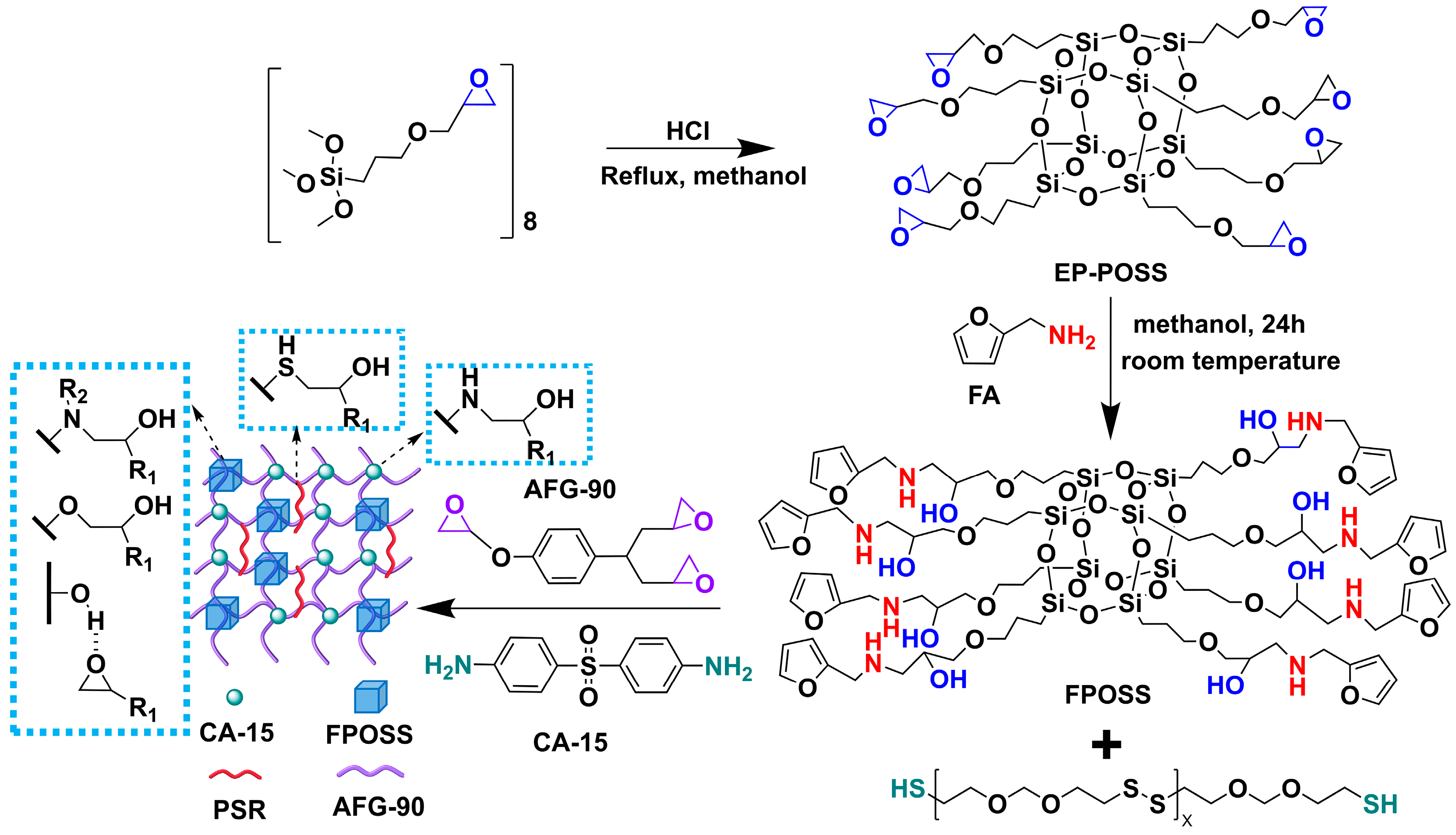- Fang, Y.; Wang, P.; Sun, L.; Wang, L. Hydrophobic epoxy caged silsesquioxane film (EP-POSS): Synthesis and performance characterization. Nanomaterials 2021, 11, 472. [Google Scholar] [CrossRef]