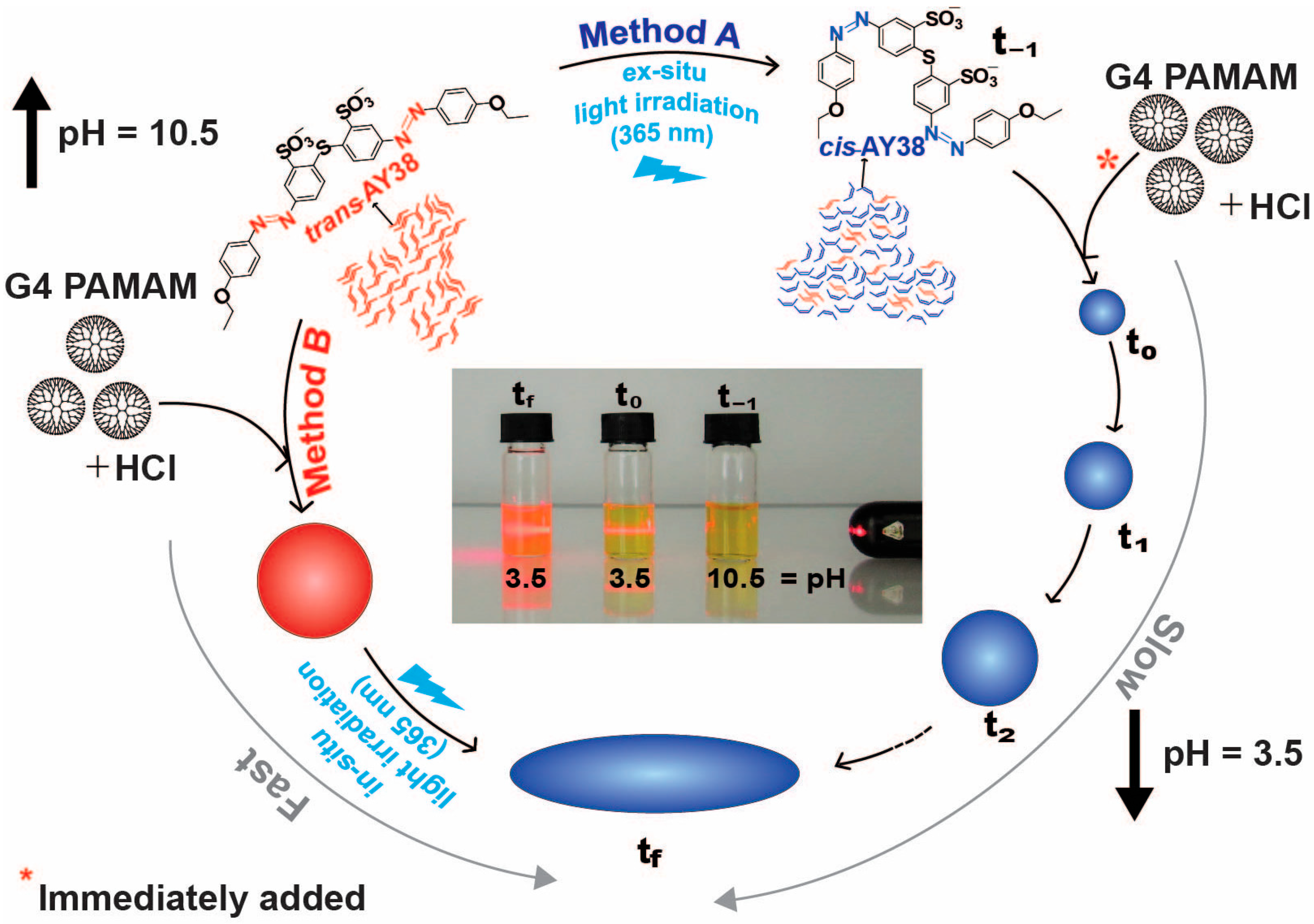 | Irradiation | Pre-irradiated AY38 (cis state) before assembly | UV irradiation during self-assembly |