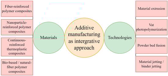 Additive manufacturing (AM), also known as 3D printing, is a game-changing manufacturing concept that is changing the design, materials engineering, and manufacturing processes in numerous industries. In contrast to traditional subtractive or mold-based production methods, AM allows direct digital-to-physical printing with less material waste, less tooling demands, and more design flexibility; thus, increasing economic and production efficiency [1]. Among the greatest benefits of AM is the absence of tooling in the form of molds, which contributes to quick prototyping and the production of personalized parts. Computer-aided design (CAD) is therefore at the core of AM since it allows optimization of geometry, controlled delivery of materials to the physical structure, and fluid transfer of digital models to the real world [2]. Though AM research has been developed actively together with digital design and computational tools, the low printability and lack of mechanical performance of monolithic polymers have limited the functionality of these materials for useful and load-bearing purposes. This shortcoming has led to intensive studies on customized polymer blends and polymer-based composites, which are associated with better mechanical stability, material efficiency, and performance, as well as less waste and a lower cost of production [3]. Long-fiber reinforced composites and especially synthetic fiber composites like glass-reinforced plastics (GRP) were initially developed in the middle of the last century, and since that time, manufacturing strategies have developed in order to improve the performance of structures and increase productivity [4]. With this combination of composite systems with AM today, it is possible to create complex architectures that are hard or impossible to create through other traditional molding or lamination methods. The potential of polymer-based AM has been significant in the engineering fields, particularly because it can produce composites with engineered material profiles [5]. Polymer-based AM methods have been used in a wide range of engineering industries in fabricating composites with engineered material profiles. However, difficulties are faced during the choice of their phase distributions, fiber aspect ratio, and the short or continuous fiber arrangement. These elements have an effect on the feedstock and printing strategy design [6]. Surface finish and resolution, as well as other similar constraints in AM, can be technique-dependent and might often be evaluated on a context-dependent basis. In early AM, the achievement of macro-scale geometric complexity was the challenge, and modern developments in voxel- and path-control of materials can be obtained using droplet-based printing, which allows local functionality and spatially programmed behavior [7]. AM has now emerged as a prospective technology in the automobile industry using polymers, which could enable a lighter structure, increased design flexibility, and new composite applications. It approves light constructions, useful design, and innovativeness utilizing composites [8,9]. Continuous fiber-reinforced polymer (CFRP) composites are very efficient and rigid in structure and have received significant attention due to their widespread interest. Such materials find extensive applications in aerospace, aviation, and civil engineering. One of the possible constraints of conventional manufacturing methods, such as resin transfer molding, is the high cost of rigid molds, rendering small-scale manufacturing less cost-effective. Emphasizing AM as an efficient and economical solution is intended to develop elaborate designs with a more flexible and cost-efficient method by allowing the creation of mold-free and fiber placement customization [10,11]. Most common and widely used additive manufacturing techniques for polymer composites involve material extrusion (i.e., Fused Filament Fabrication (FFF) and Direct Ink Writing (DIW)), vat photopolymerization (i.e., Digital Light Processing (DLP) and Stereolithography (SLA)), powder bed fusion of polymers (i.e., Selective Laser Sintering (SLS)), and material jetting (Material Jetting, inkjet printing). They have been instrumental in both the production of complex composite parts, the elimination of the need for molds, waste reduction, cost reduction in labor, and error reduction in production. They enable the capability of accurately controlling filler materials as well as facilitate the creation of polymer composites with functional features of a desired design that would otherwise have been too difficult to accomplish [12,13]. In that regard, AM provides a more flexible and cost-efficient method by allowing the creation of mold-free and fiber placement customization, but difficulties in scaling and consistency are still present [14,15,16,17]. Simultaneously, market trends have increasingly focused on sustainability, where the use of biodegradable polymers, recycled feedstocks, and bio-based reinforcers is being increasingly implemented under the regulation of environmental concerns and lifecycle [18,19]. PLA is heavily utilized in industry among biodegradable polymers, due to excellent life cycle efficiency, decreased logistics demands, and decreased logistics demands. Reinforcing PLA with natural fibers increases its effectiveness for load-bearing applications [20]. Four-dimensional printing is a continuation of 3D printing that introduces the fourth dimension of time so that structures printed can alter their shape or functionality in response to the surrounding environment, e.g., water, light, heat, pH, or magnetic flux. This has been made possible by smart materials that are programmable and will change once fabricated. The latest development with multi-material 3D and 4D printing has greatly expanded the level of customization and performance and has overcome the constraints of traditional manufacturing by blending polymers, metals, ceramics, and biom