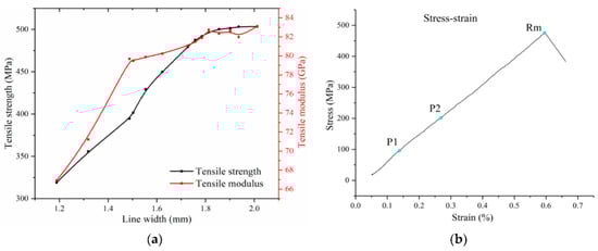 Tensile properties of printed specimens: (a) tensile strength and modulus with different line widths; (b) stress vs. strain curves of specimens with 1.785 mm line width [49].