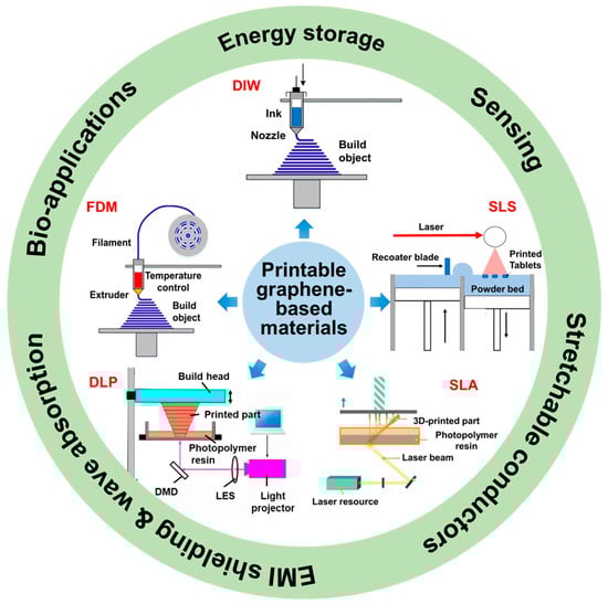 During the last decade, the field of 3D printing of structures based on graphene materials has actively developed, with many more intricate and high-performance structures being developed. Strategies such as extrusion-based, photopolymerization, and powder-based 3D printing have turned out to be useful in the production of pure graphene and graphene/polymer composite materials [92,93,94,95]. Our paper demonstrates the formation of complex structures of graphene, including functionalized composites, porous scaffolds, and lattices with controlled porosity, developed through a number of approaches based on 3D printing. With such capabilities, these architectures are of great potential in a wide range of applications, including storage of energy, sensing, conductivity, wave absorption, and biomedical applications, all of which have been made possible with the help of carefully designed materials and processes. Figure 4 demonstrates a compilation of the important printing methods and multifunction of graphene and graphene/polymer composites.
