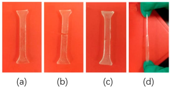 Representative photographs of an elastomer specimen after processing and curing: (a) intact sample, (b) sample after cutting, (c) sample after self-repair following curing at 80 °C for 24 h, and (d) specimen under continuous tensile loading, showing necking without fracture [110].