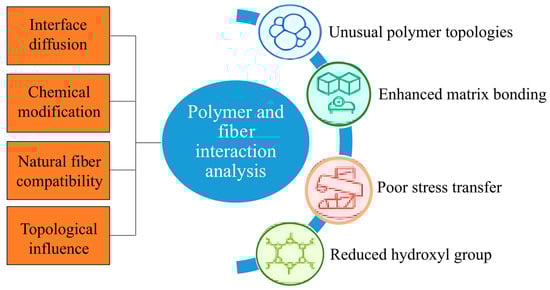 The idea of tuning surface properties by using polymers with unusual topologies has long drawn attention, though the exact mechanisms driving surface segregation are still not fully clear. Part of this curiosity likely arises from how topology appears to influence both the structure and dynamics of polymer systems, sometimes in ways that are not easily predictable and may depend on subtle molecular interactions [123]. Research may suggest how the repetitive chemical units in polymer chains affect interface diffusion; however, further studies are still needed on molecular weight and architecture in relation to preferential adsorption [124]. For linear and cyclic polymer blends, self-consistent field theory may suggest that cyclic polymers will aggregate more at the interfaces, regardless of their molecular weight, although experimental observations have disputed this theoretical expectation [125]. The combination of natural fibers and polymers raises a lot of concern, especially due to their varying chemical structures that are quite different. This dislocation may disrupt the transfer of stress at the interface. To solve this, fiber treatment with a reactive functional group is usually investigated. These adjustments can assist in minimizing moisture absorption and enhancing, at least partially, the compatibility between fiber and matrix, but it does not appear that adhesion perfection can be reached [126]. According to Kabir et al. [122], chemical treatment is important in the processing of natural fibers. It seems that these treatments can decrease hydroxyl groups, and this causes a decrease in fiber hydrophilicity, potentially resulting in an increase in mechanical strength and dimensional stability. However, the magnitude of such improvements will be dependent on the applied methodology. Figure 6 outlines polymer and fiber interaction analysis, which highlights four interaction domains such as interface diffusion, chemical modification, natural fiber compatibility, and topological influence.