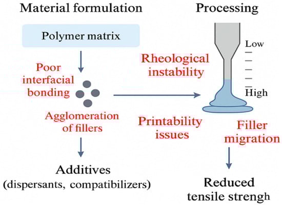 A major limitation is moisture absorption, arising from the hydrophilic nature of lignocellulosic fibers. Water uptake can cause fiber swelling, microcracking at the fiber–matrix interface, plasticization of the polymer matrix, and gradual loss of interfacial shear strength. As a result, mechanical properties (strength, modulus, impact resistance) may deteriorate significantly under humid or wet service conditions, particularly when printed parts contain porosity or imperfect fusion typical of extrusion-based AM [78,79,80].