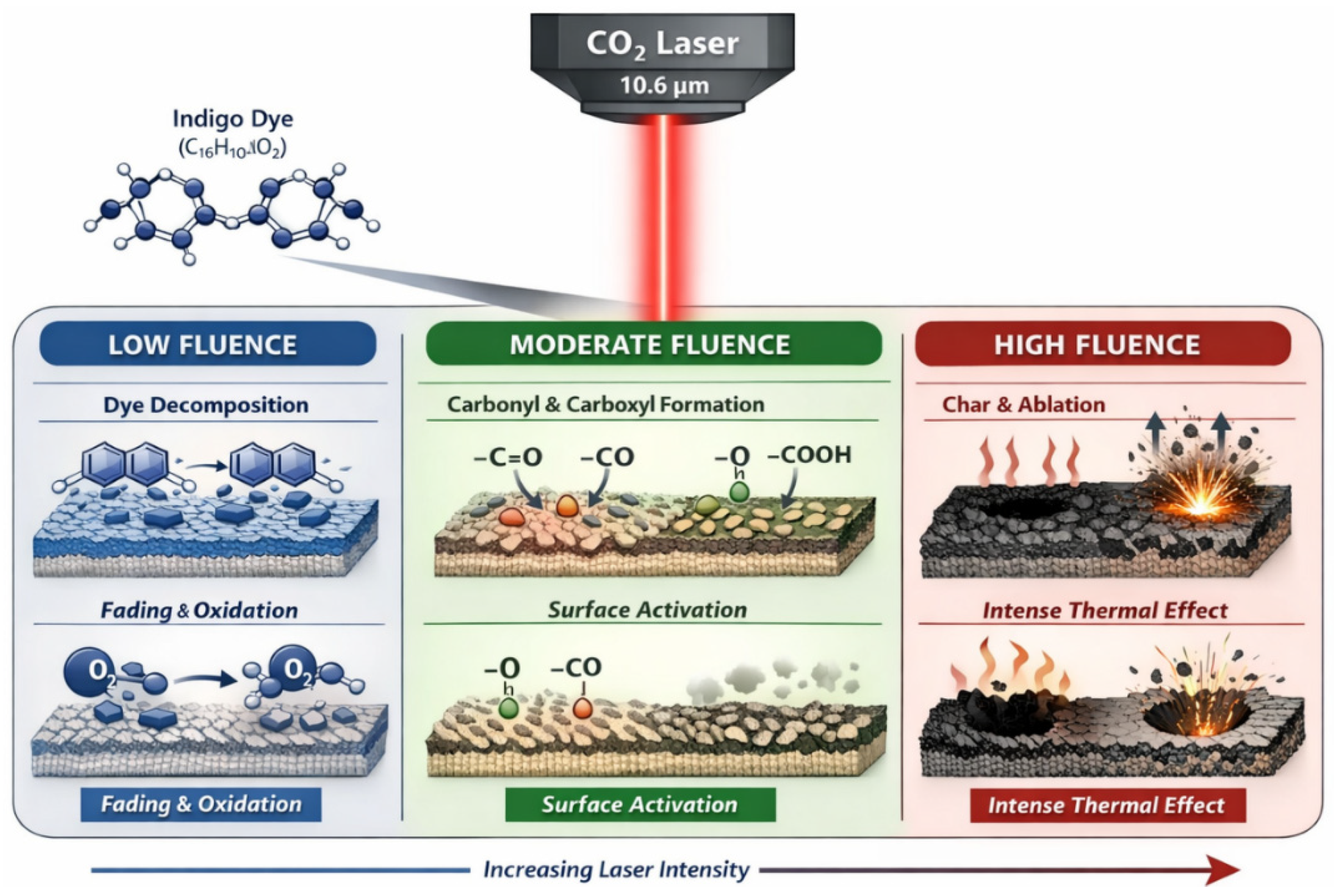 | “Thermal ablation: remove dye + some fibre” | Laser energy heats and vaporises or decomposes indigo dye on the fibre surface and sometimes removes pieces of fibre. |