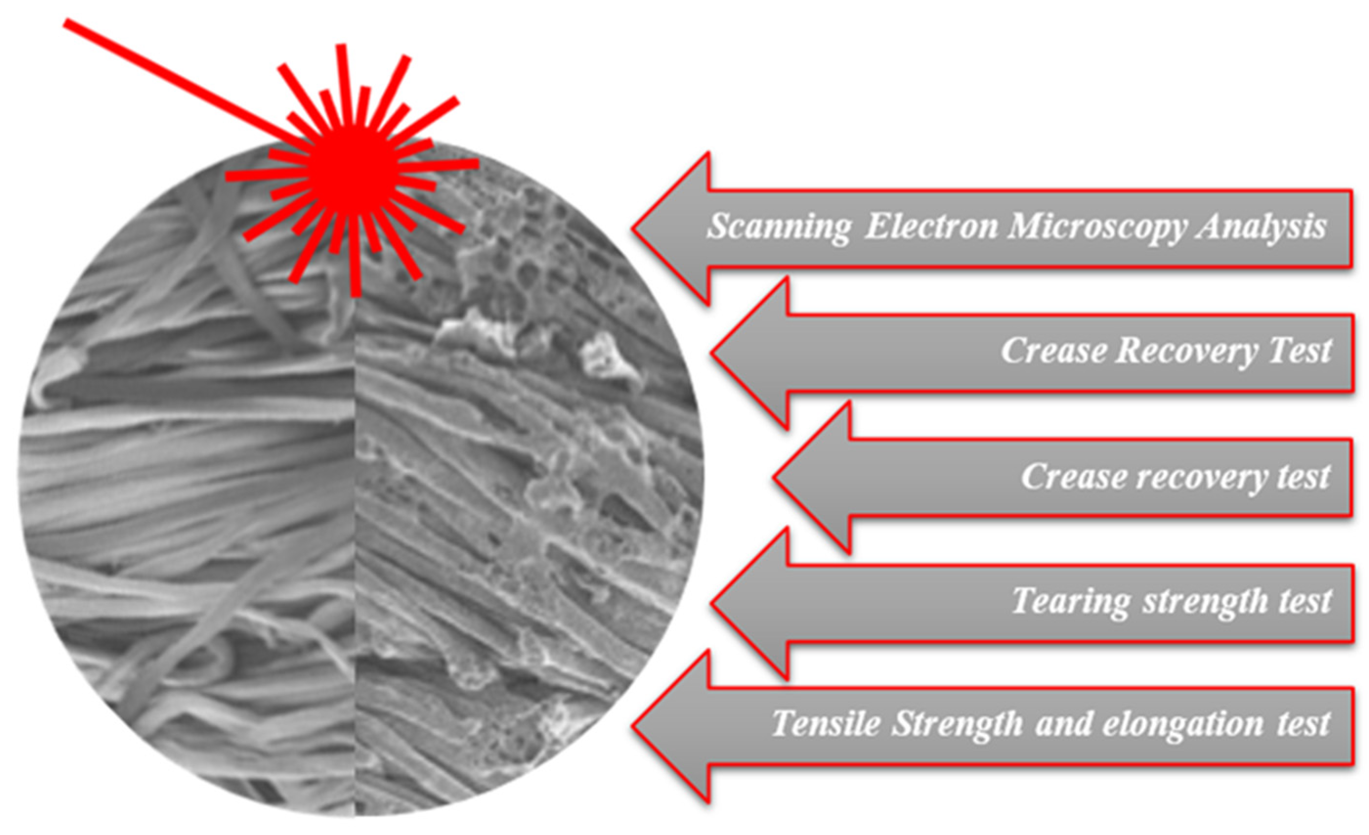 - Ahmad, S.; Ashraf, M.; Abid, S.; Jabbar, M.; Shafiq, F.; Siddique, A. Recent Developments in Laser Fading of Denim: A Critical Review. J. Nat. Fibers 2022, 19, 11621–11631. [Google Scholar] [CrossRef]
