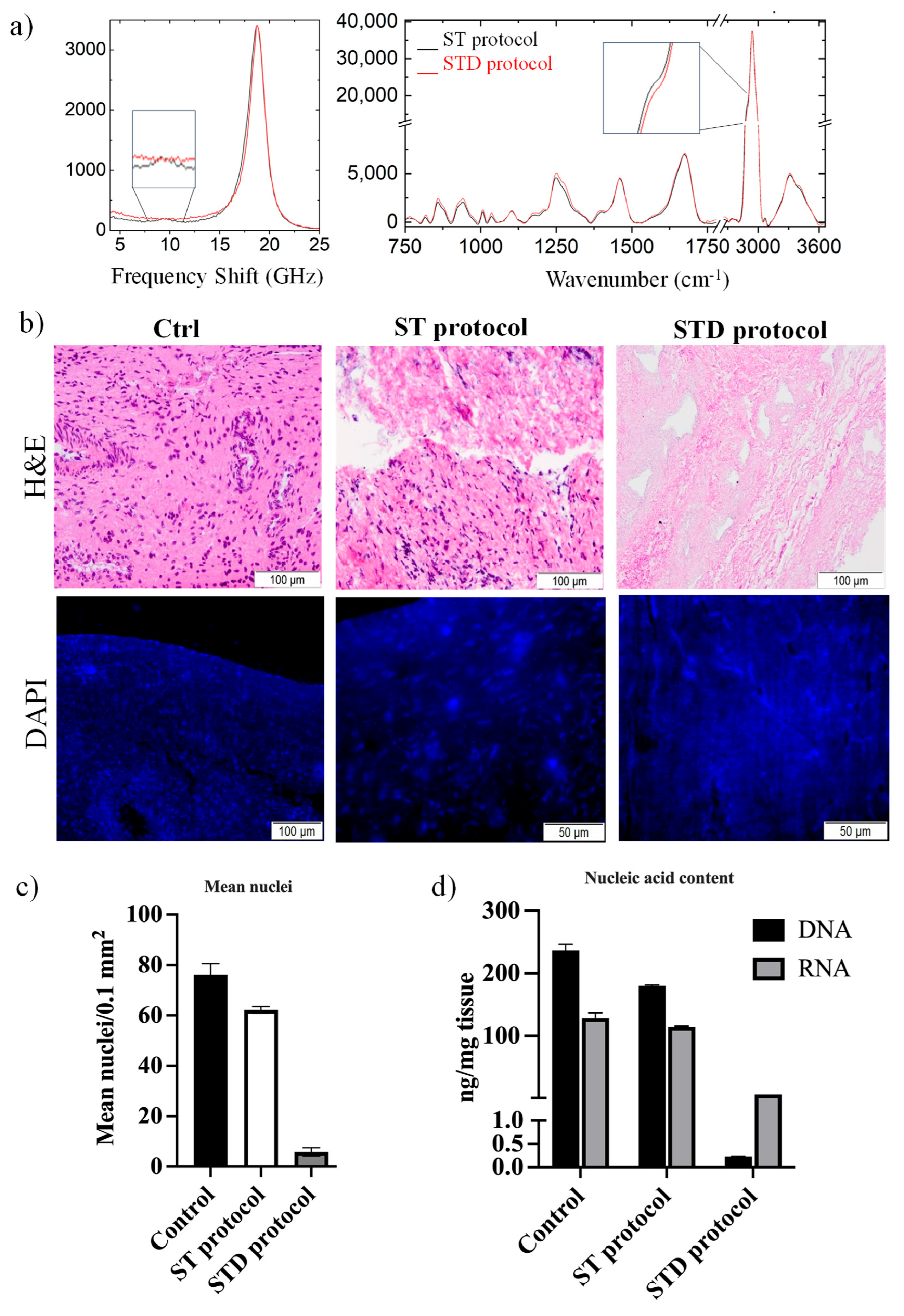 3.2. Chemo-Mechanical Characterization, Histology, and DNA/RNA Content Evaluation of the dECM Produced via ST and STD Protocols