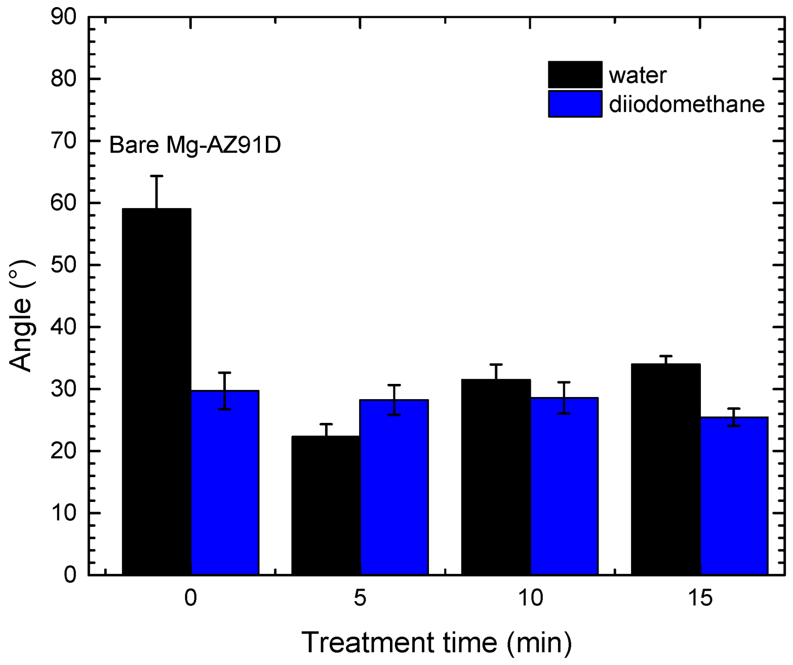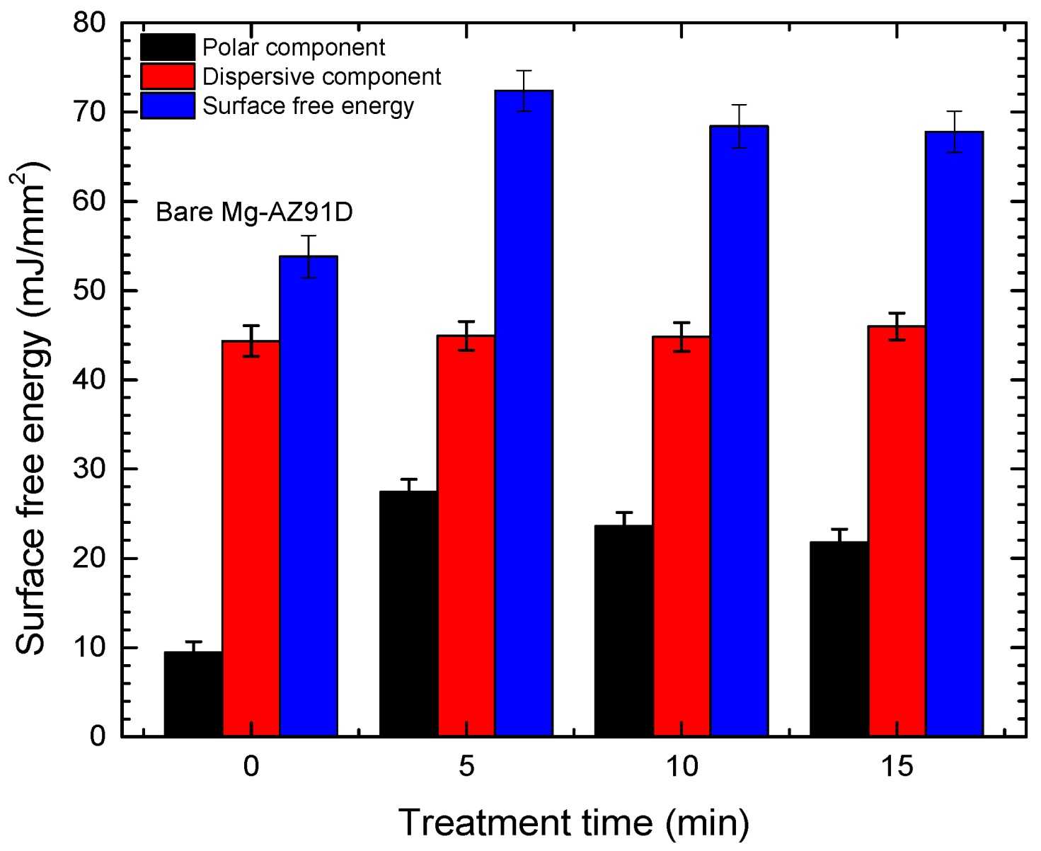 Figure 2 illustrates that the untreated Mg-AZ91D surface exhibited a surface free energy of 53.82 mJ/mm