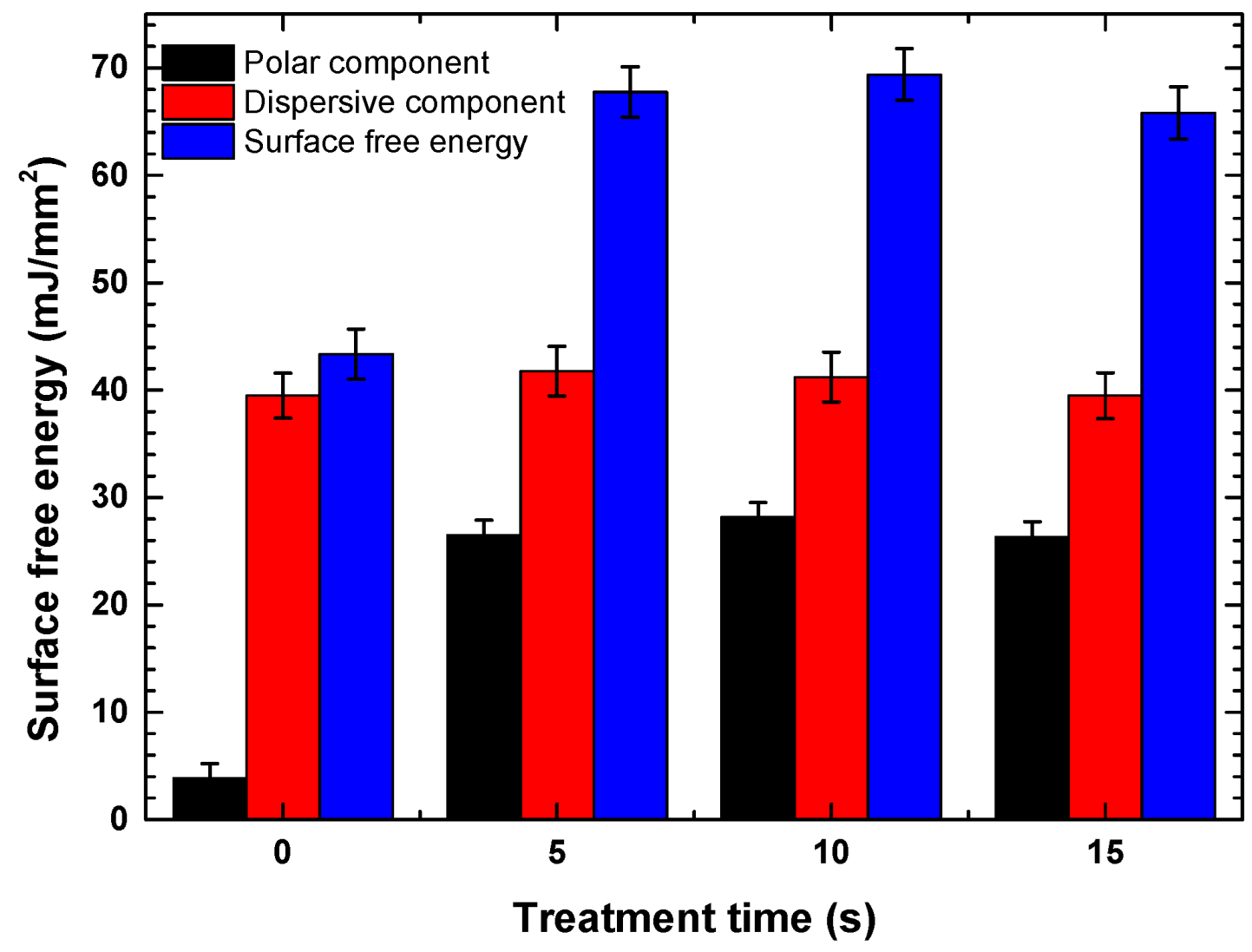 2. After plasma exposure, the polar component increased substantially, reaching its highest value in the sample treated for 5 min, which resulted in a total surface energy of 72.4 mJ/mm