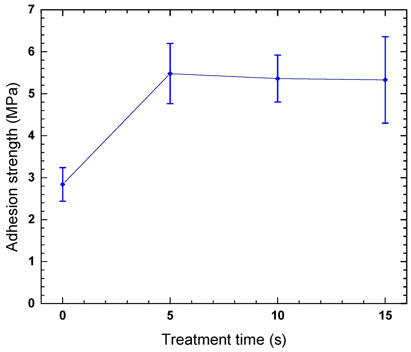 2. After plasma treatment for 5, 10, and 15 s, values of 67.75, 69.38, and 65.80 mJ/mm