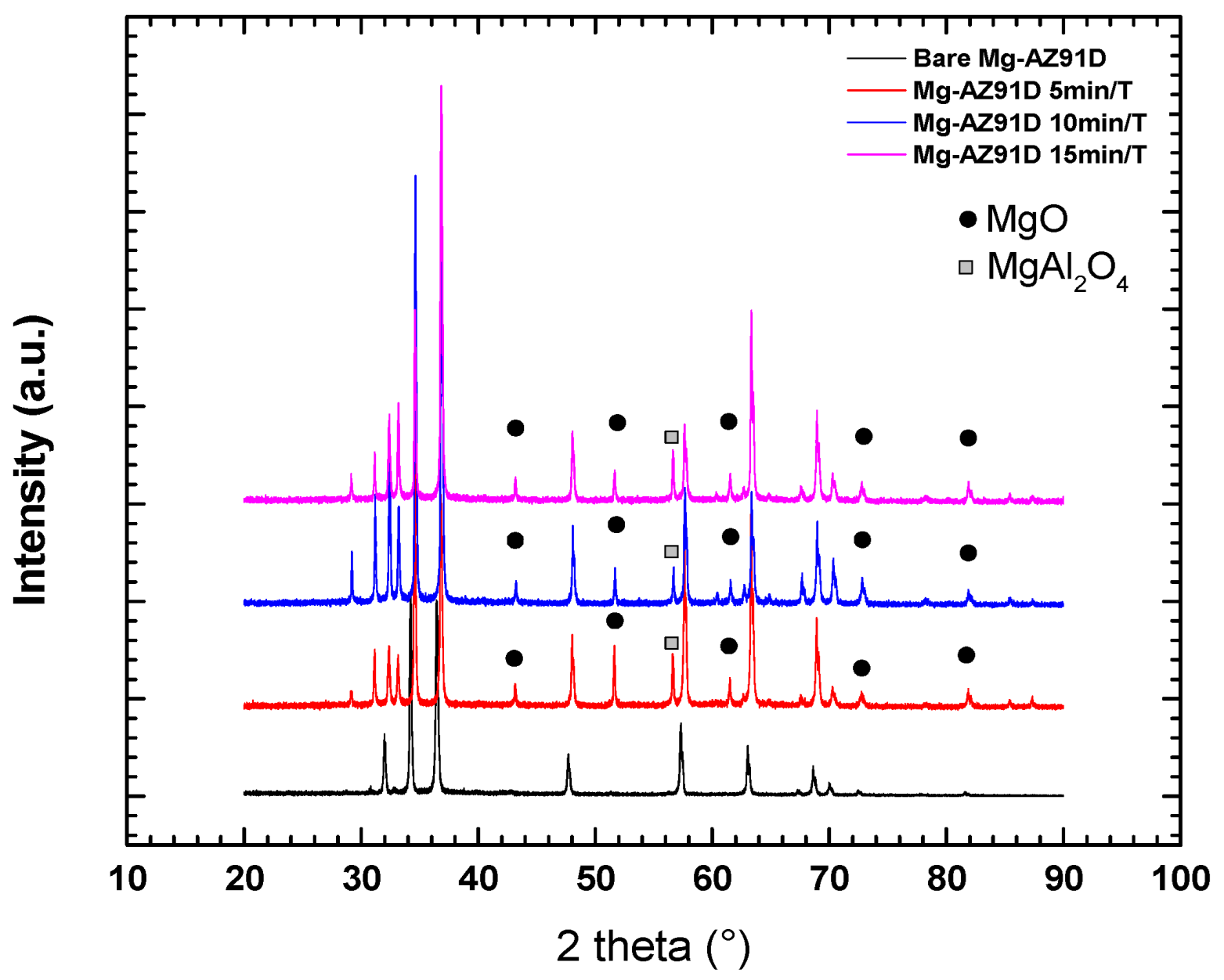 X-ray diffraction analysis revealed the main phases of the Mg-AZ91D alloy, including α-Mg (located at 2θ angles of 31°, 34°, 36°, 47°, 63°, and 70°) and β-Mg