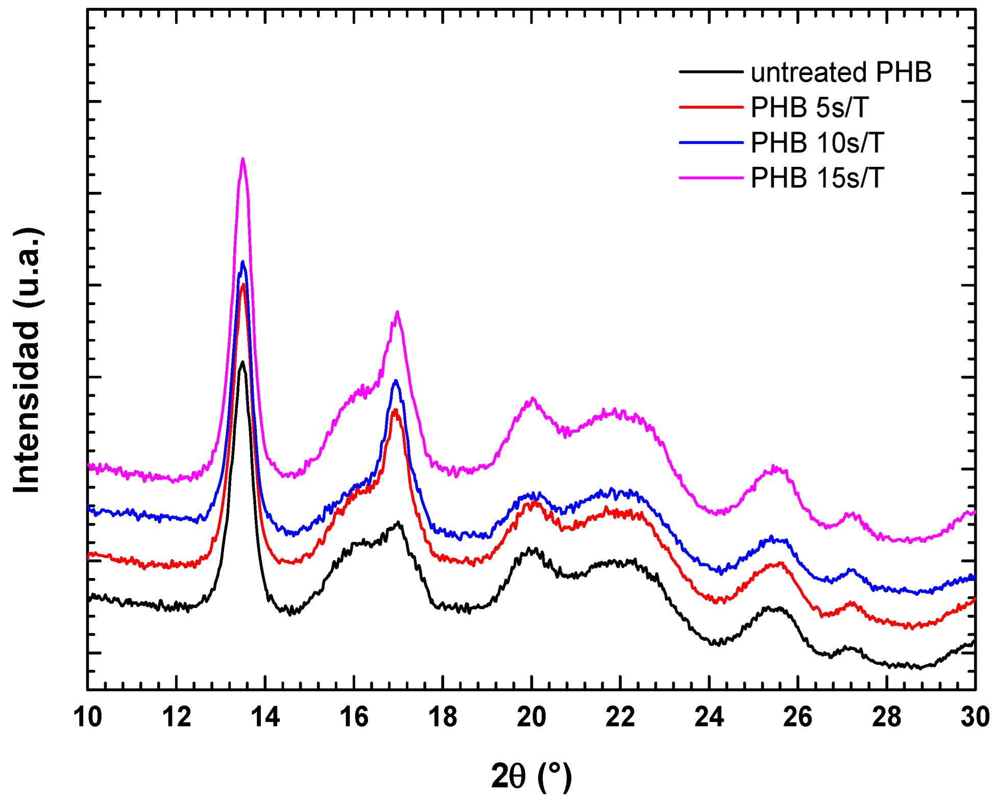 An increase in the FWHM and definition of the peak at around 2θ ≈ 13° is observed for untreated PHB; these increase with treatment time up to 10 s, which is related to an increase in polymer crystallinity. Additionally, the crystallite size (Xs) was calculated for the characteristic peaks (