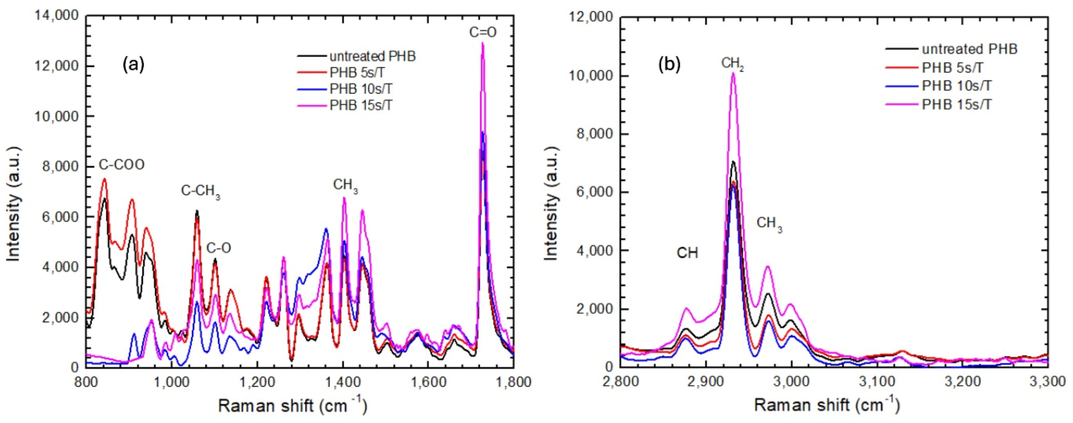 The Raman spectra of PHB that was untreated and plasma-treated for 5, 10, or 15 s exhibit characteristic peaks associated with the functional groups and molecular bonds of this polyester. The most relevant bands are those at 1725 cm
