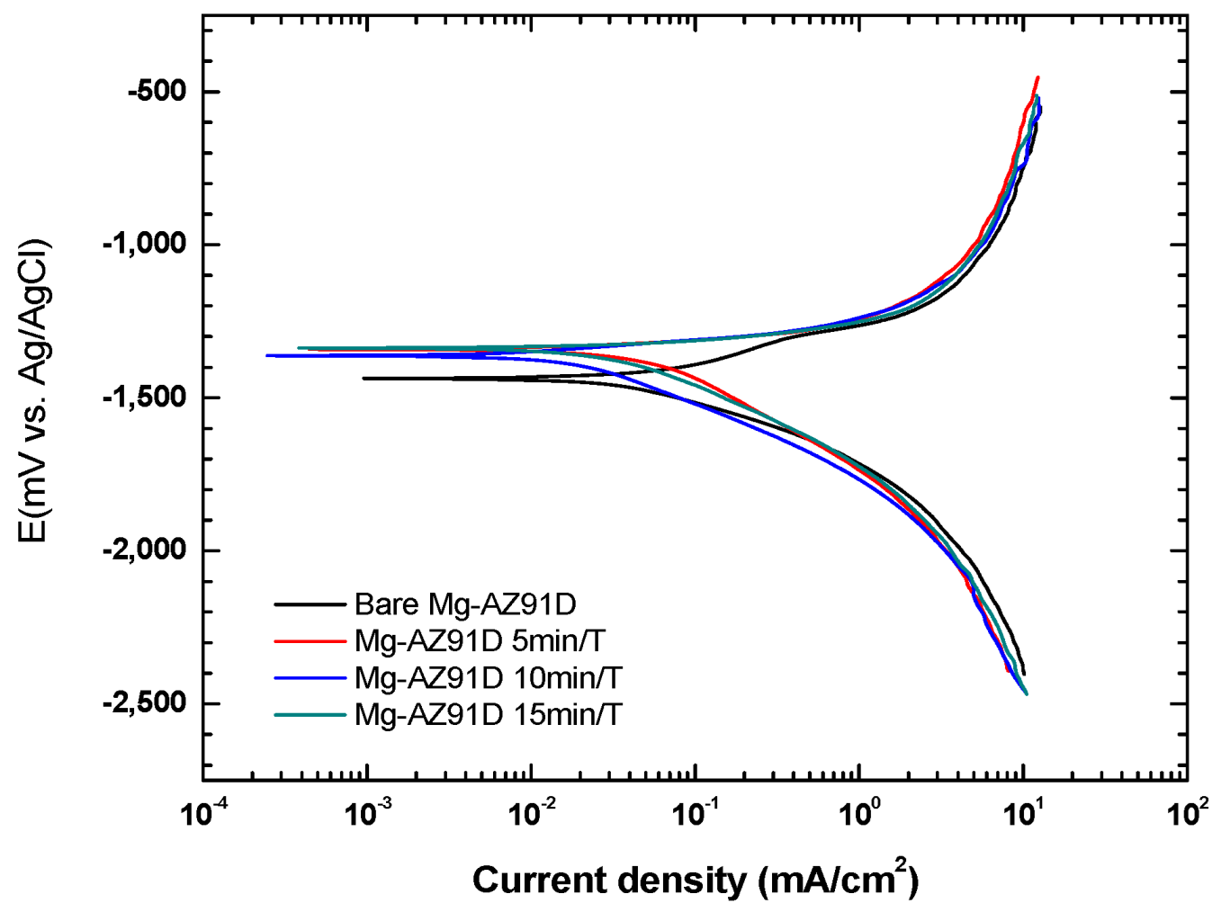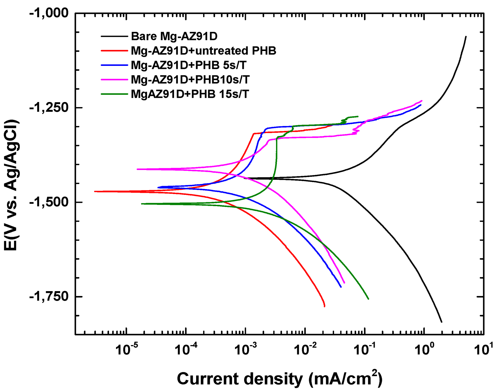 Figure 13 shows the potentiodynamic polarization curves of bare Mg-AZ91D and Mg-AZ91D treated with plasma for 5 min and coated with PHB, which was also plasma-treated for 5, 10, or 15 s in HANK solution. The corrosion potential (E