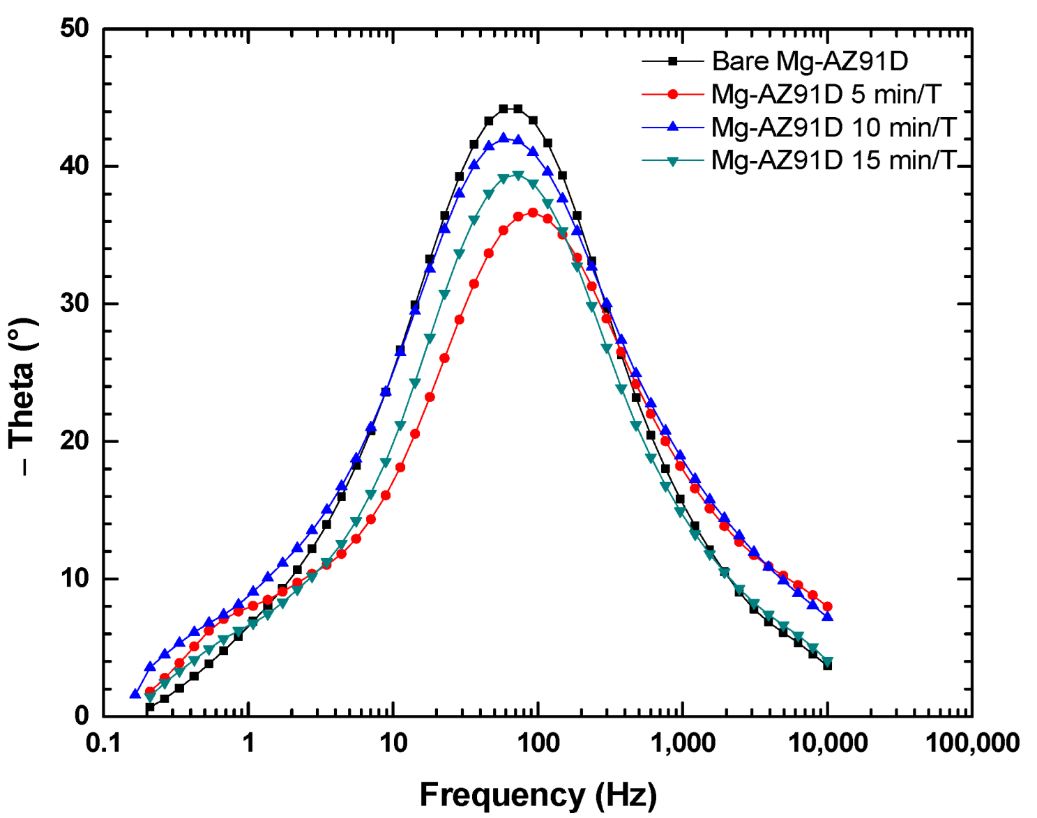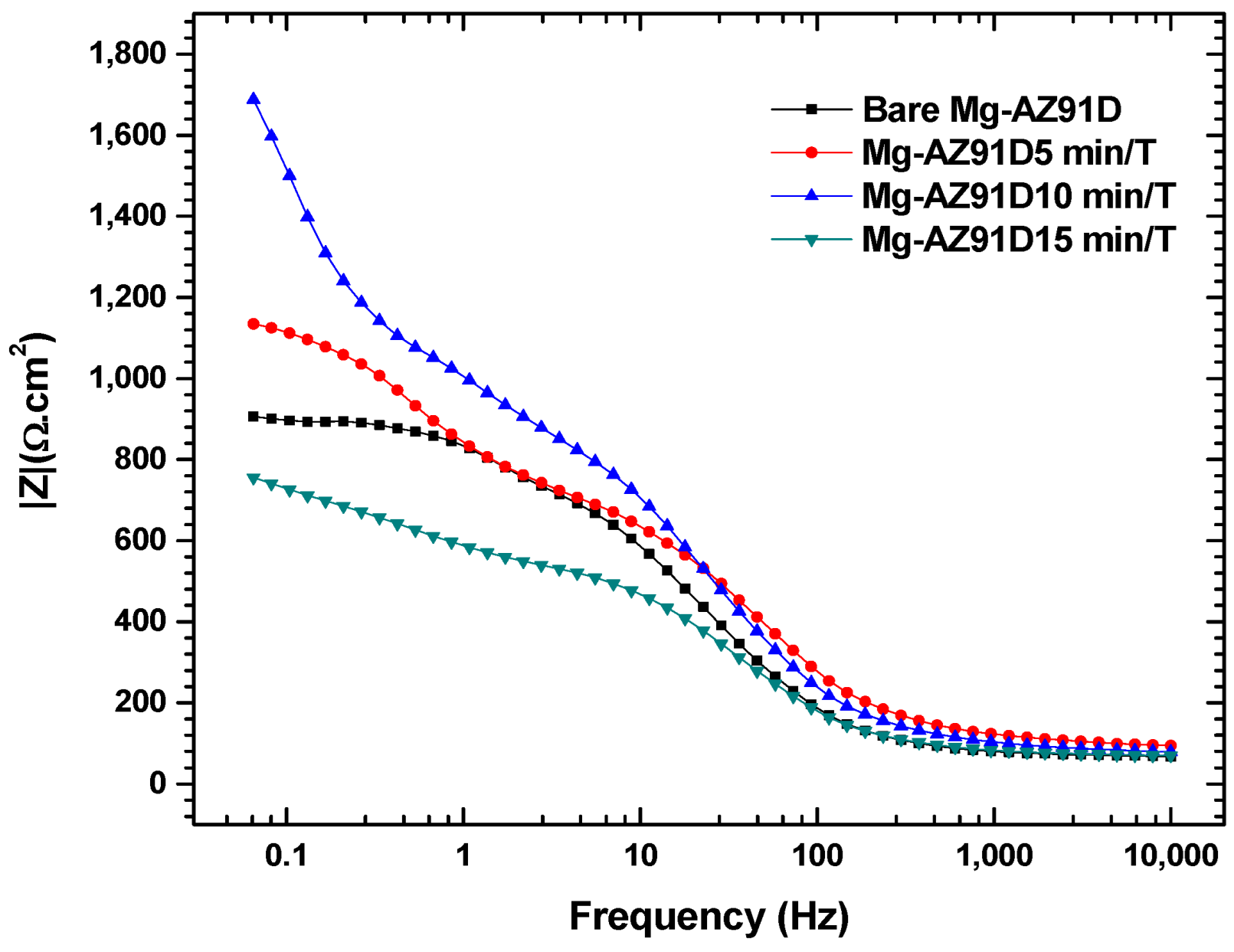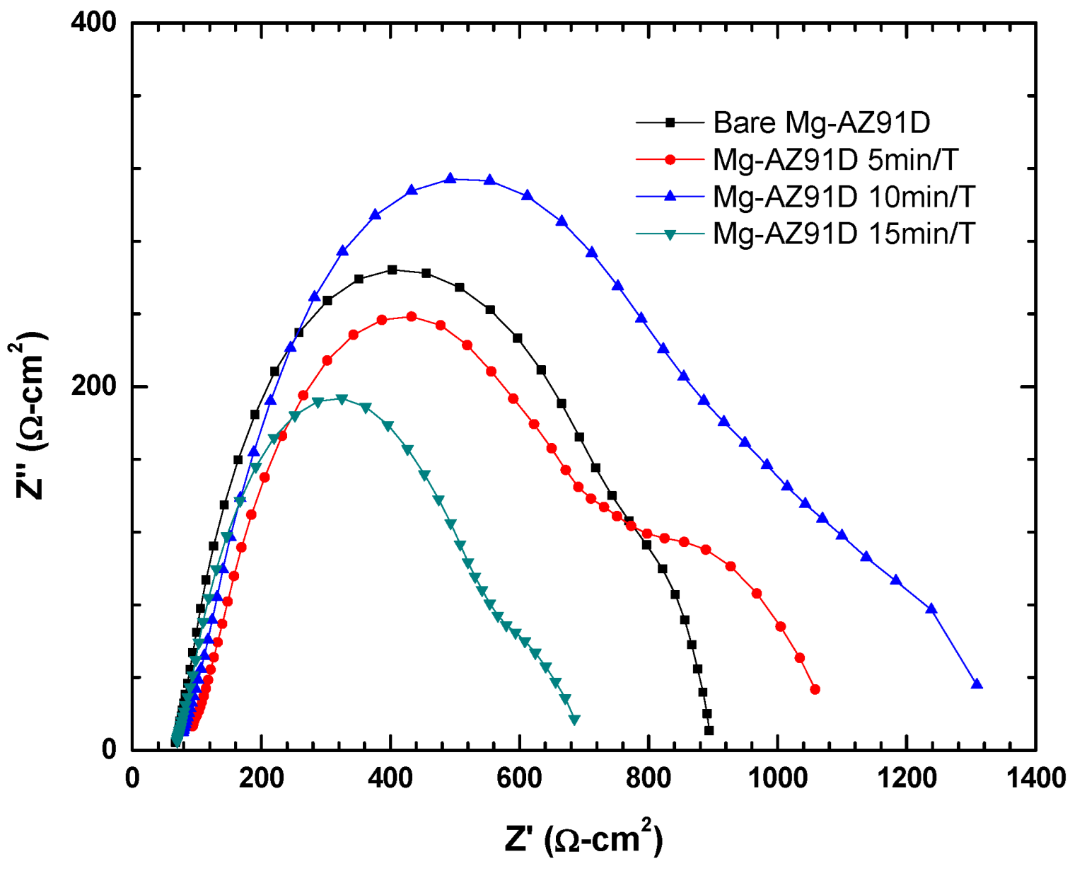 Figure 10 shows the electrochemical impedance spectroscopy results of Mg-AZ91D after different plasma treatment times. A semicircle is observed in all four conditions, which is characteristic of a charge transfer process [