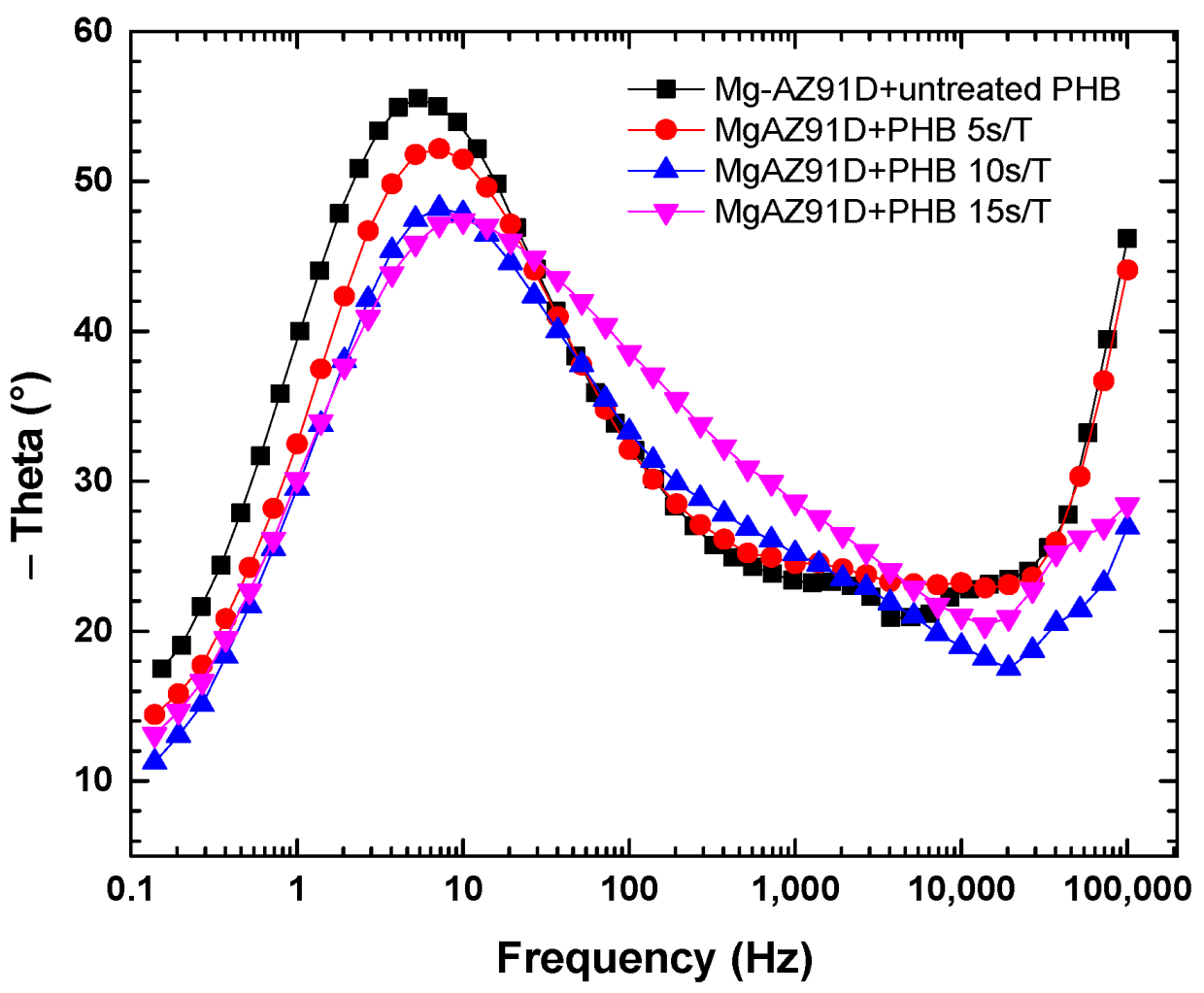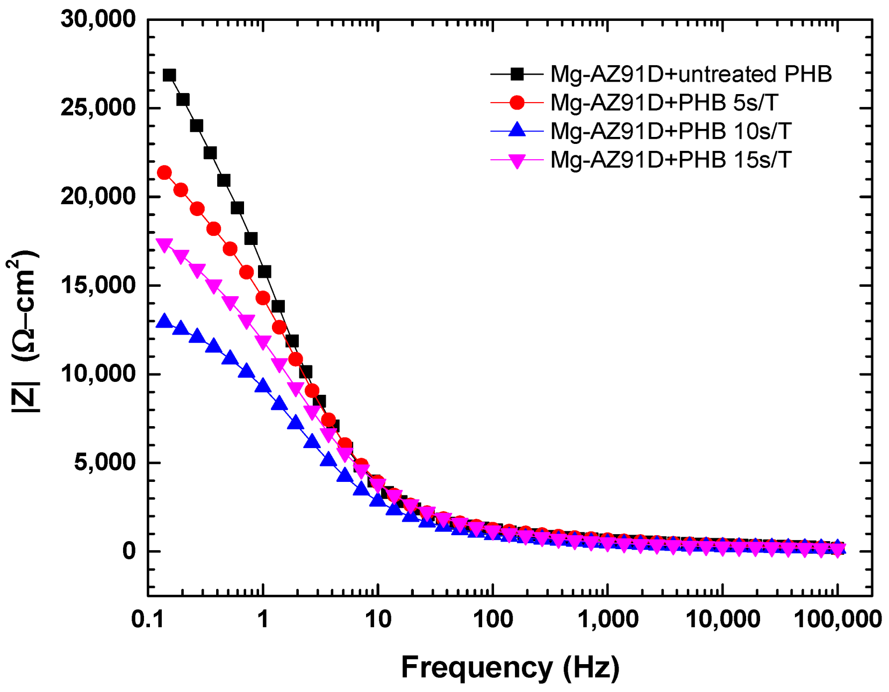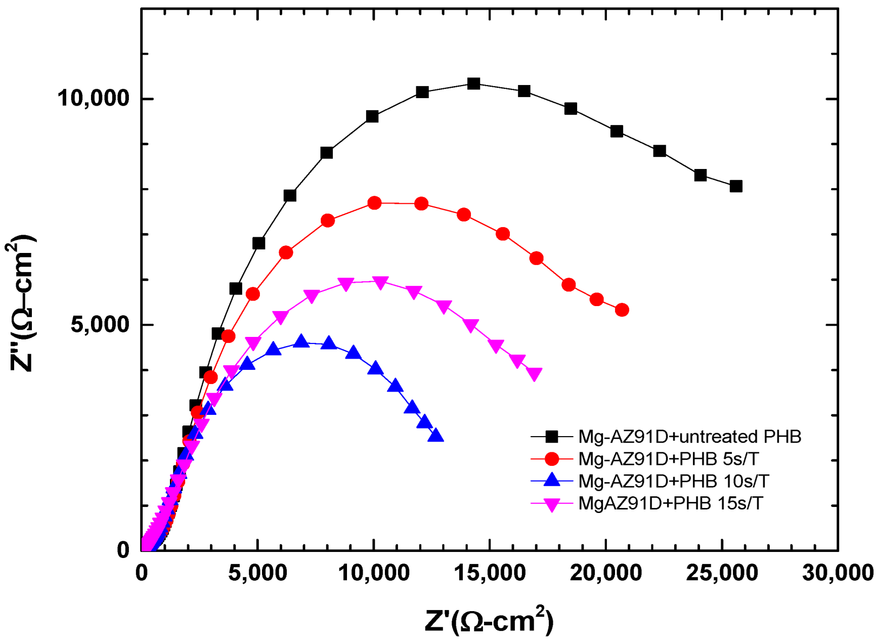 Figure 16. The Mg-AZ91D samples were first treated with atmospheric plasma for 5 min and then coated with PHB, which was subjected to plasma treatment for varying durations (5, 10, or 15 s). The Nyquist plots (