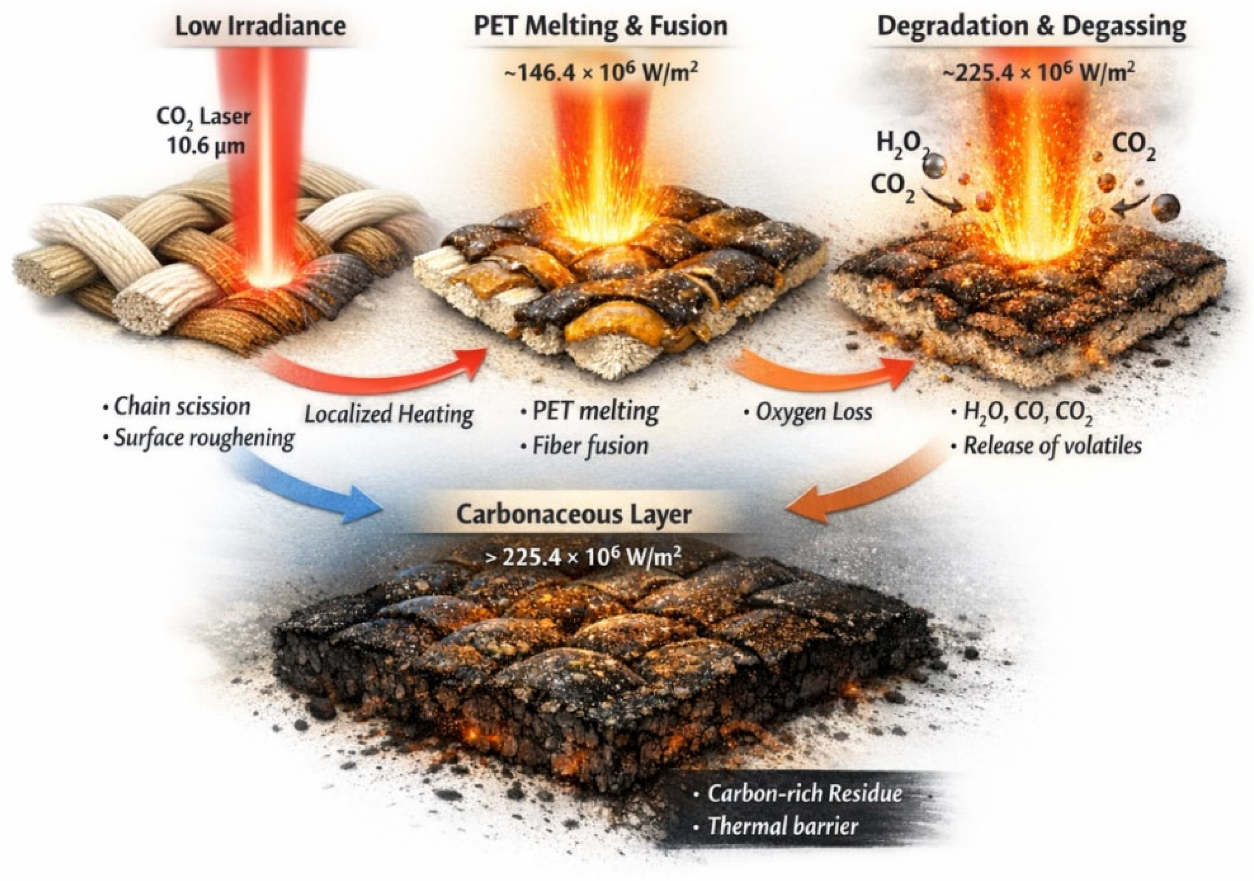 - Melting and Fusion (Intensity ~146.4 × 106 W/m2): The polyester (PET) component, having a lower melting point, begins to melt and coat the cotton fibers, creating a carbon-rich amorphous layer.