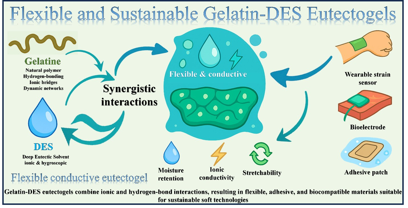 - Eutectic solvent effects—DES acts not only as an ionic medium but also as an adhesion-stabilizing agent. Due to its high hygroscopicity, DES suppresses gel drying and freezing, maintaining a conformal and stable contact at different temperatures and humidity levels—thus preventing one of the major causes of failure of conventional hydrogels [71].