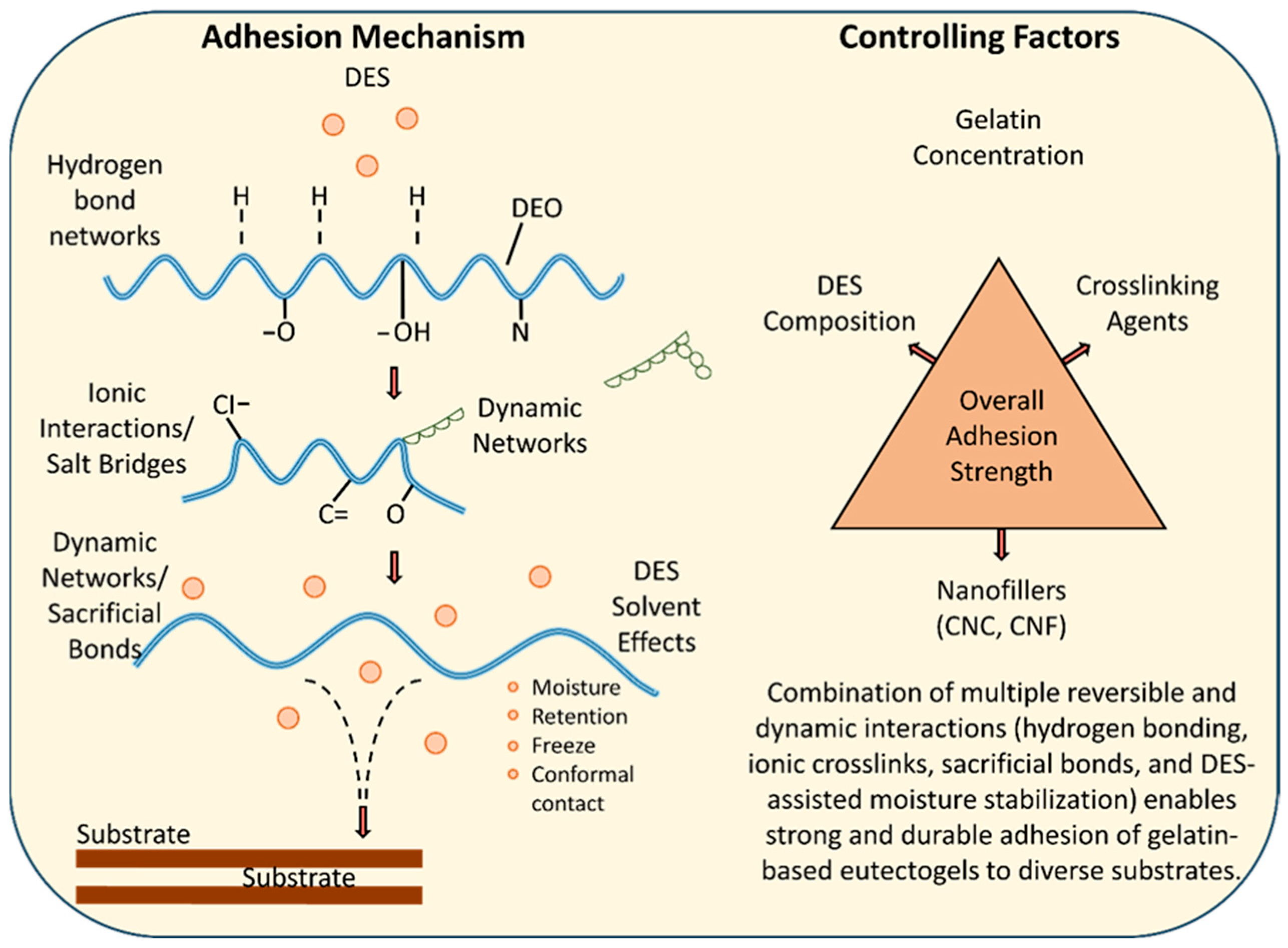- Ionic interactions and salt bridges—The ionic components of DES, especially ChCl and monomeric acids (such as acrylic acid), participate in the formation of electrostatic bridges between the gelatin chains and the adherent substrate. These Columbic interactions enhance the energy dissipation at the interface and increase the shear and exfoliation resistance [36].