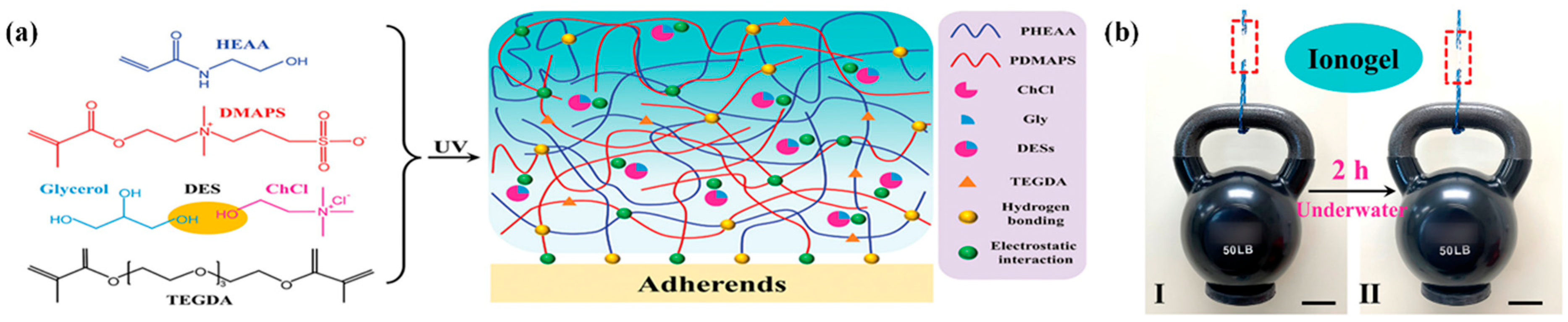 - Ge, G.; Mandal, K.; Haghniaz, R.; Li, M.; Xiao, X.; Carlson, L.; Jucaud, V.; Remzi Dokmeci, M.; Wei Ho, G.; Khademhosseini, A.; et al. Deep Eutectic Solvents-based Ionogels with Ultrafast Gelation and High Adhesion in Harsh Environments. Adv. Funct. Mater. 2023, 33, 2207388. [Google Scholar] [CrossRef]