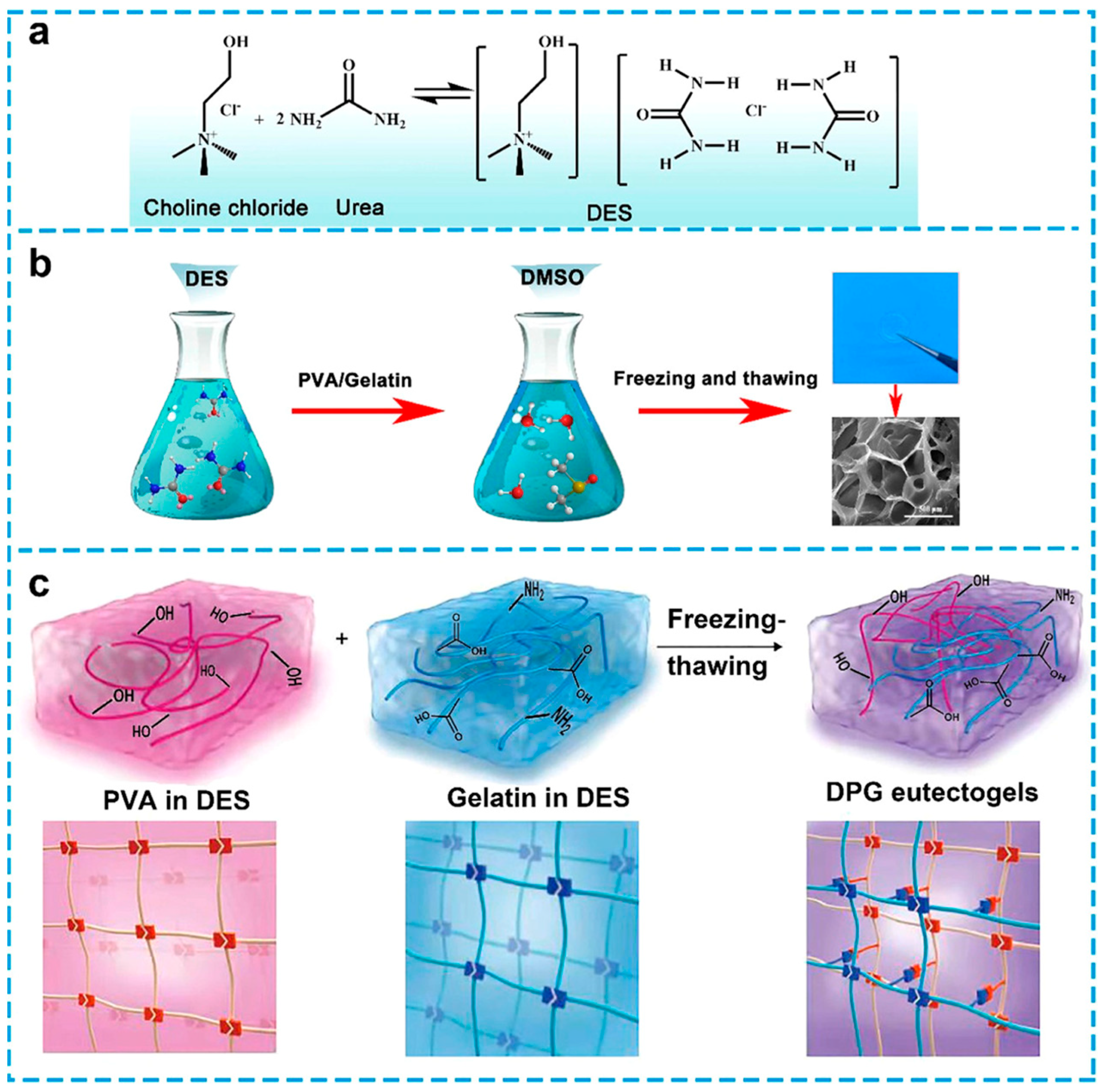 | DES-induced conductive hydrogels | ChCl-based DES | Polysaccharide hydrogels | DSC, conductivity tests | Combined ionic conductivity and anti-freezing stability | [85] |