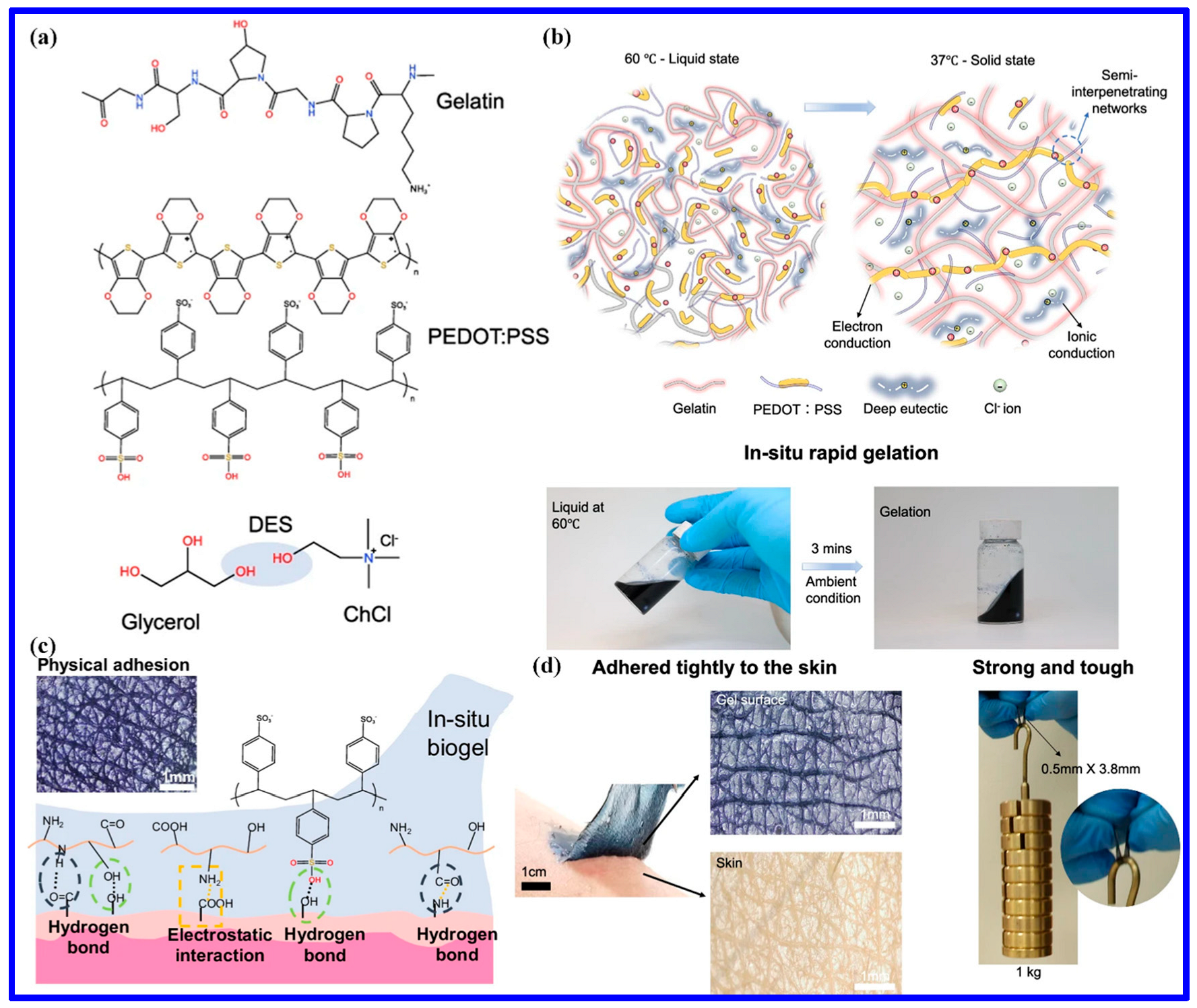 | Gelatin (20% w/v) + PEDOT:LS + DES | Stable via triple helix | Mixed ionic + electronic | Lignin sulfonate enhances adhesion | 3D-printable wearable sensors | [64] |