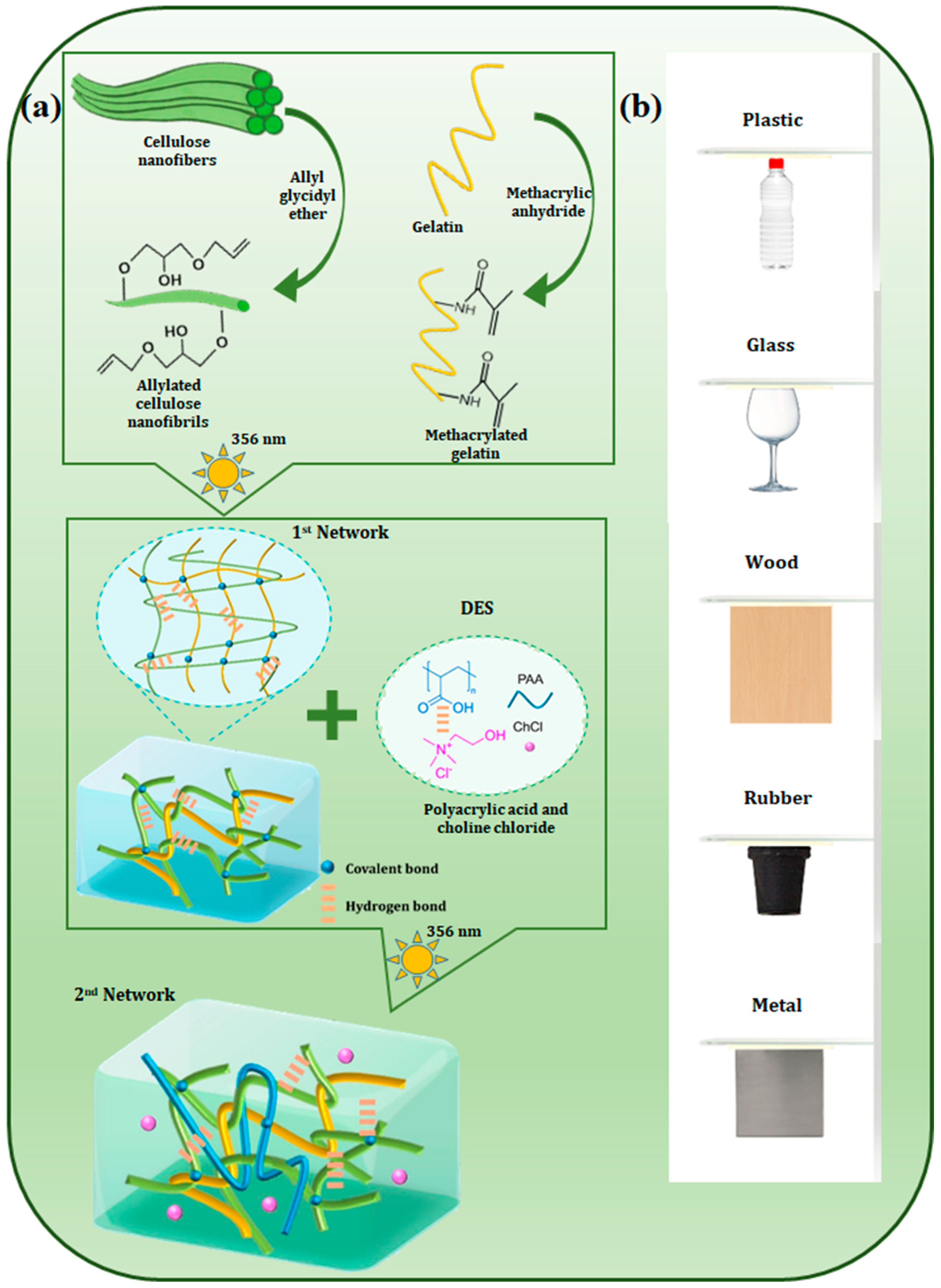 - Li, X.; Fan, S.; Ma, J.; Zhu, Z.; Guan, D.; Ren, S.; Ma, Y.; Li, S. Tough, Highly Resilient and Fatigue-Resistant Cellulose-Based Double-Network Elastomers with Environmental Tolerance for Multi-Domain Sensing. Chem. Eng. J. 2025, 523, 168273. [Google Scholar] [CrossRef]
