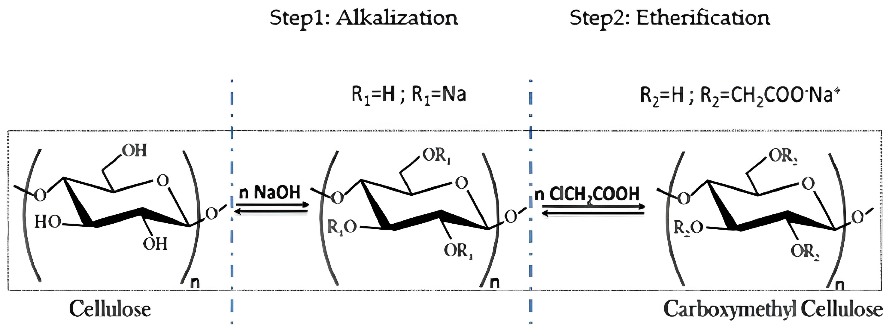 For the alkalization step, 10 g of purified cellulose was mixed with 60 mL of n-butanol and 60 mL of 40% aqueous sodium hydroxide solution. The mixture was stirred continuously at 60 °C for 12 h to convert the hydroxyl groups (–OH) of the cellulose into alcoholate groups (–ONa), thereby activating the cellulose for subsequent etherification [12,13].