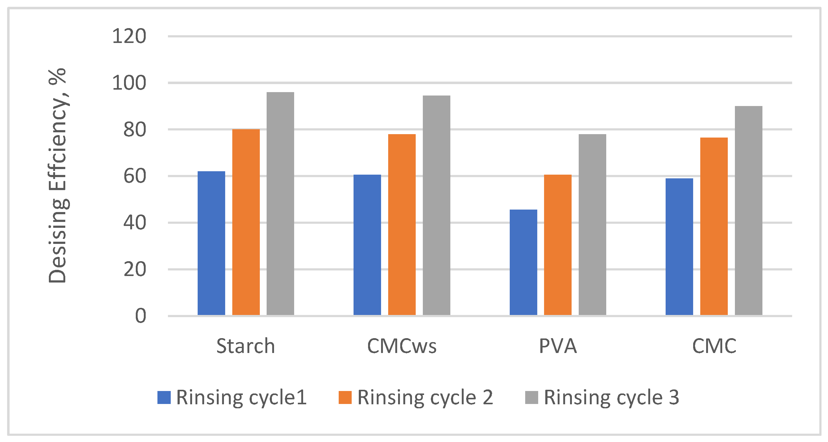 The sizing solution was applied to 100% cotton fabrics by immersion under controlled laboratory conditions. After impregnation, the fabrics were dried to a constant weight and subsequently subjected to desizing treatments in a water bath under specific bath ratio, temperature, and time conditions. Complete desizing was achieved by boiling the fabrics in water at a bath ratio of 1:50 (kg fabric: L water) for 30 min, until a constant weight was obtained. To assess desizing performance, the sized fabrics, characterized by known size add-on values (%), were rinsed in water at 90 °C for three successive cycles, each lasting 5 min, using a bath ratio of 1:10 (kg fabric: L water). After rinsing, all samples were oven-dried at 105 °C for 4 h, and their weights were measured to determine the amount of size removed. The desizing efficiency DE (%) was obtained based on mass differences by the following Equation (6) [27]: